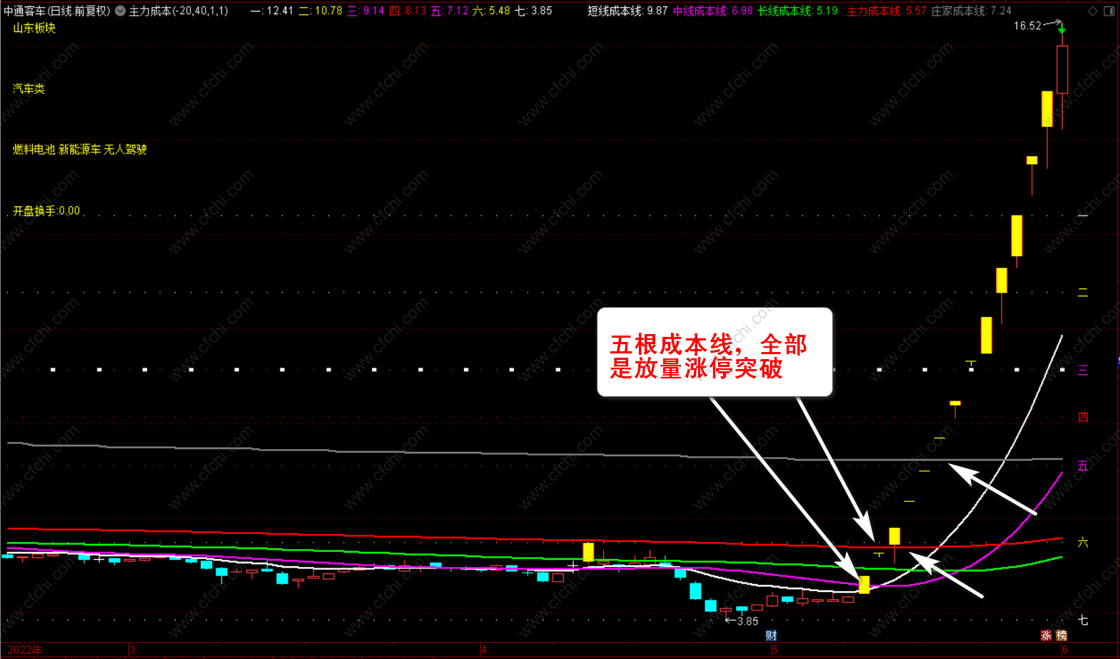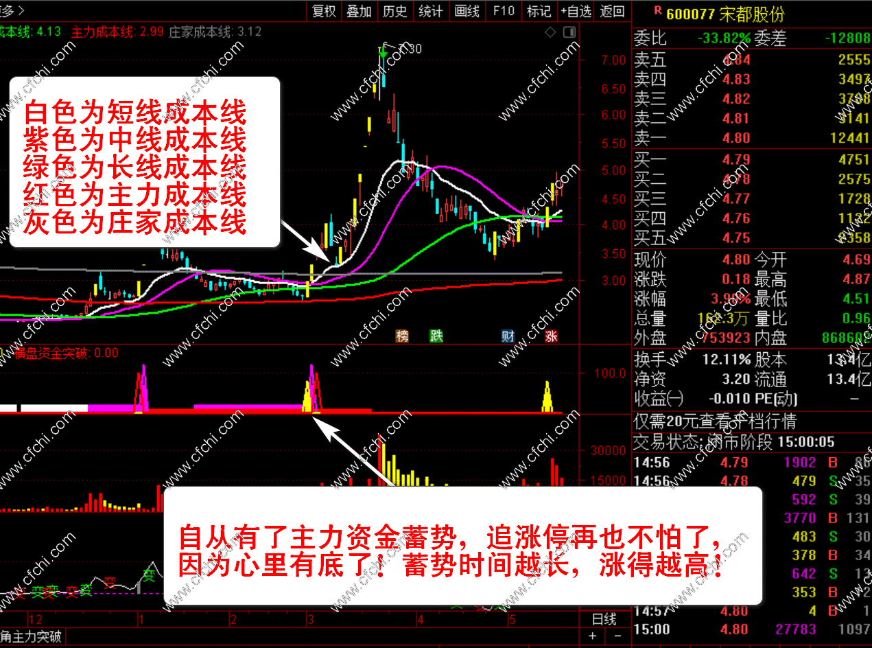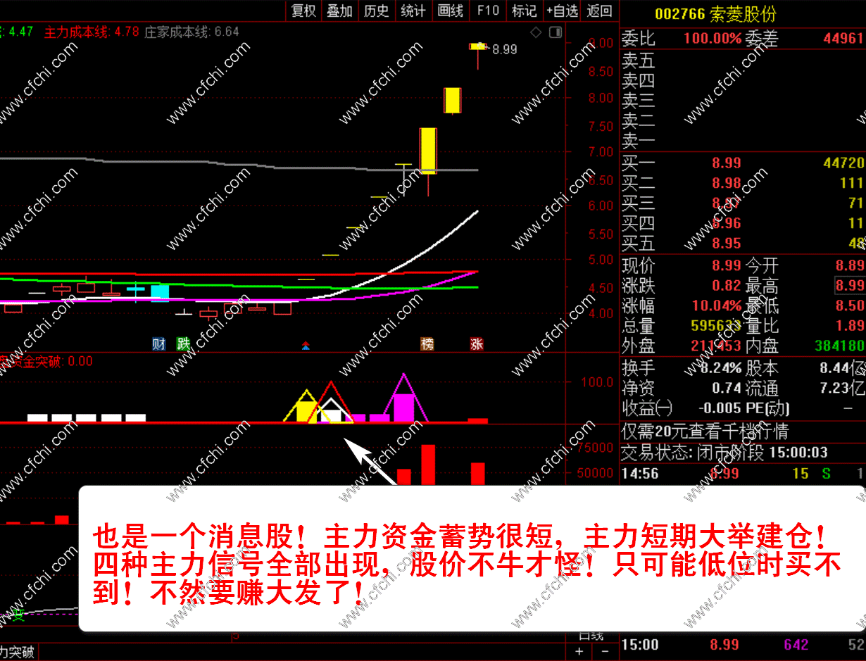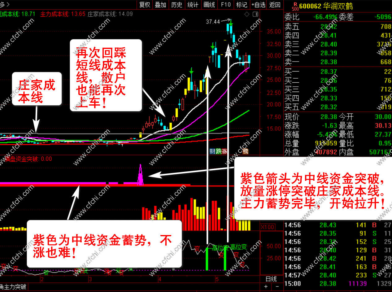 3、【中线资金突破】+【短线资金突破】+【趋势资金突破】+【横盘资金突破】四个选股指标。