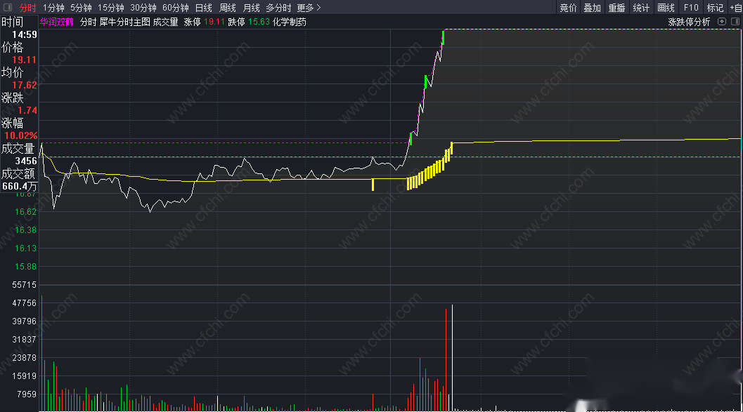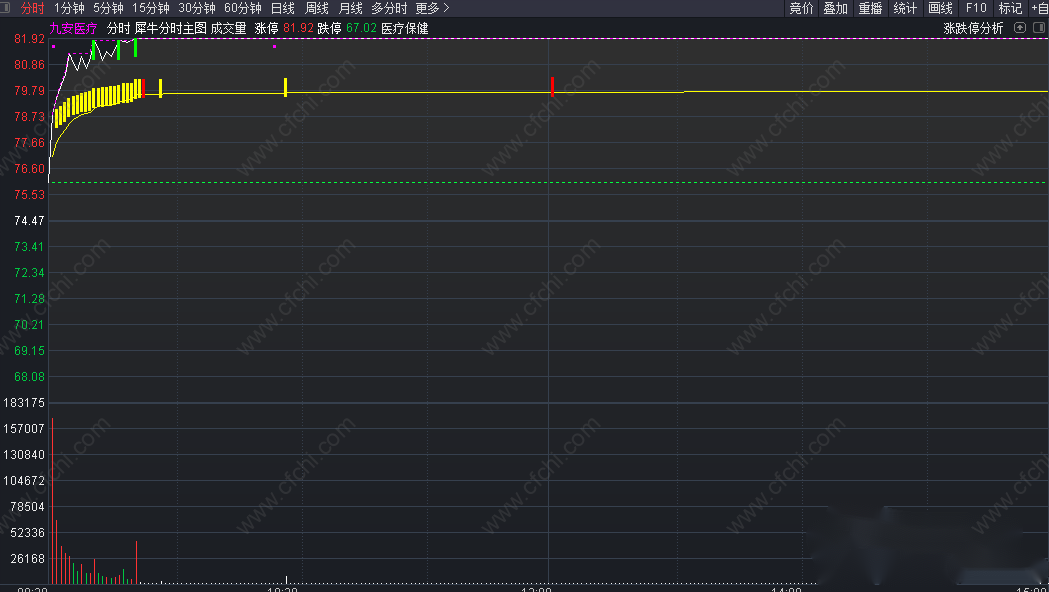 | 分时图中: 黄色柱体:代表主力资金进场。柱体越多表示主力资金进场越多;柱体越密集表示主力资金抢筹活跃。 紫色虚线:代表日内压力位。 绿色柱体:代表突破压力位。 绿色虚线:代表开盘价,开盘价可以看作日内的最强支撑与最强压力。 此指标,是半路抓板的绝佳工具。 |