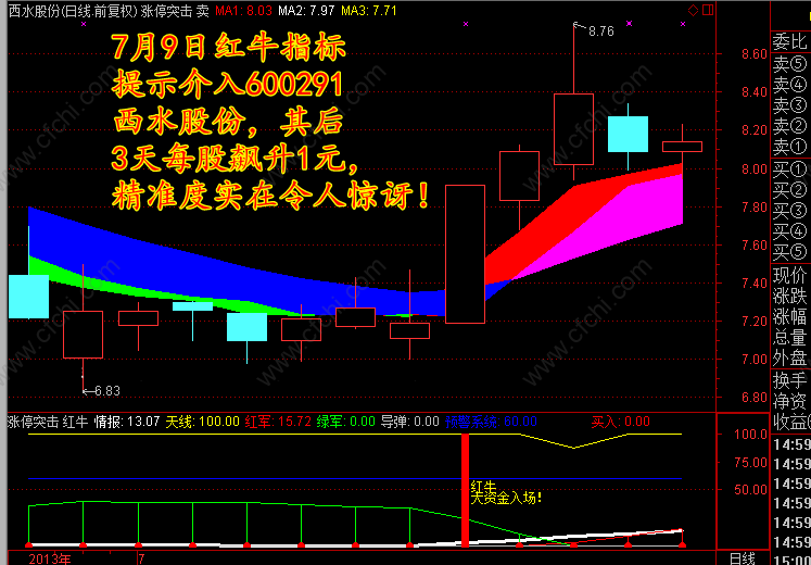 7月9日600291西水股份出现金牛指标提示可以介入,其后3天该股每股涨了1元