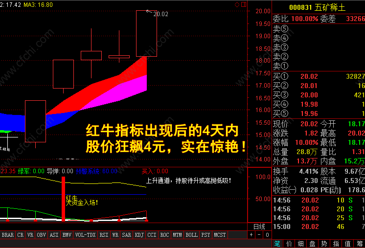 7月5日000831五矿稀土出现红牛指标,其后4日该股连续上涨,股价涨了4元