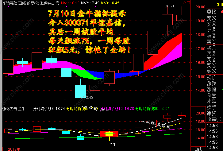 7月10日金牛指标发介入300071华谊嘉信的信号,其后一周该股每股平均每天涨7个点,一周涨了5元!