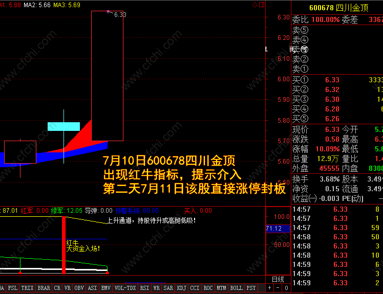 7月10日600678四川金顶出现金牛指标提示可以介入,隔日该股直接涨停封板!