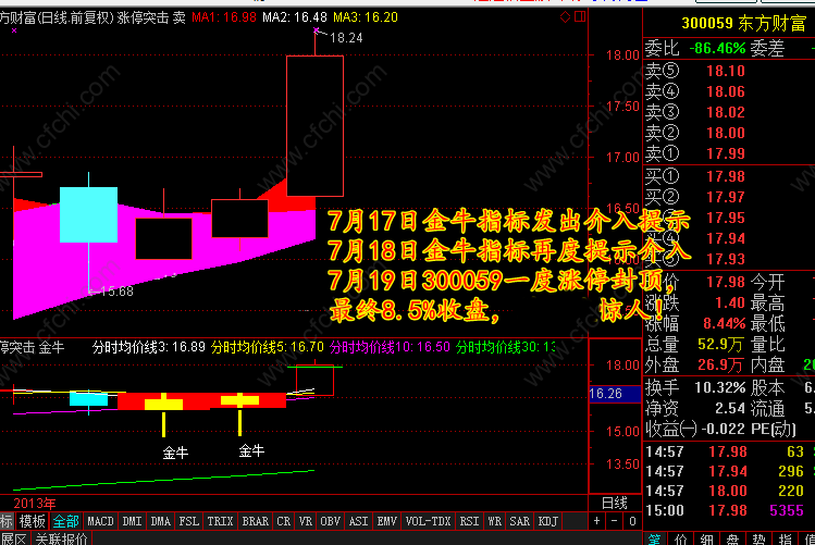7月17日金牛指标发介入300029东方财富的信号,7月18日再度 发出介入信号,7月19日该股一度涨停封板!最终以8.5%收盘