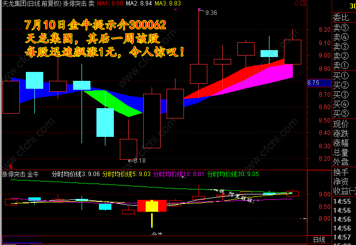 7月10日金牛指标发介入300063天龙集团的信号,其后一周该股每股飙涨1元!收益达到10%收盘