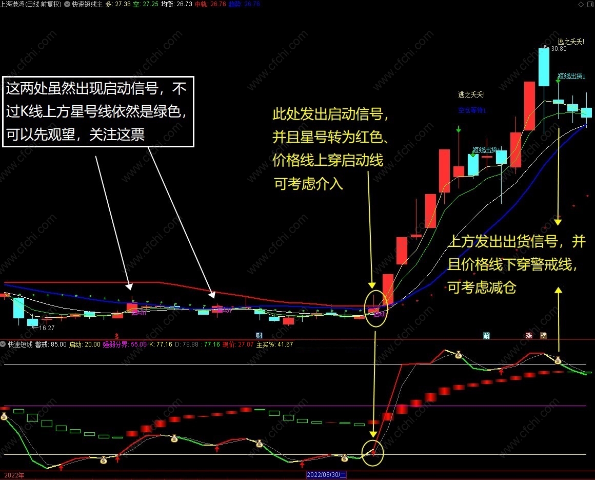 1、本指标是一个短线主图+副图指标,指标有警戒、启动、强弱分界线,和买入卖出信号标志,显示股价当前所处阶段,一目了然。