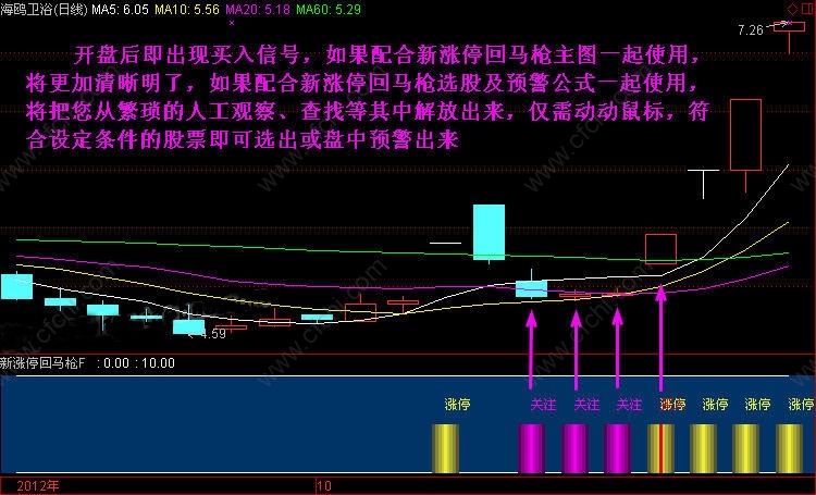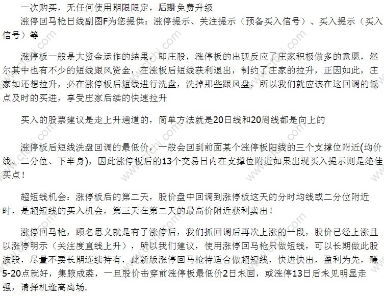 新涨停回马枪全套指标,包括一个主图指标、一个副图指标和两个选股公式。使用新版的涨停回马枪指标第一:要关注有涨停基因的股票;第二,注意涨停的位置(实盘中关注低位涨停没有大幅上涨的股票);第三:注意一定要选择上升趋势的股票,一浪上涨,二浪回调,三浪主升浪的回调买入时机;配合新涨停回马枪选股公式和副图指标的关注、买入信号提示进行操作;