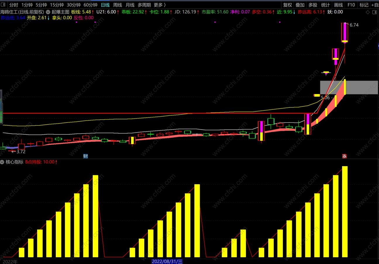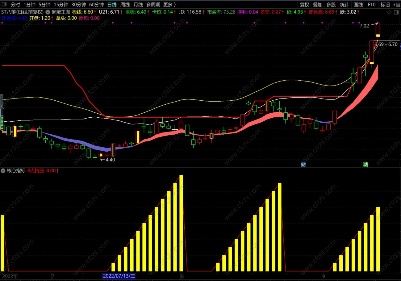 3,选股指标为B点持股为1的信号,信号比较充裕,可根据自己的风险偏好自主选择低位、中位还是次高位介入,优选可选择4个点以上的阳线。