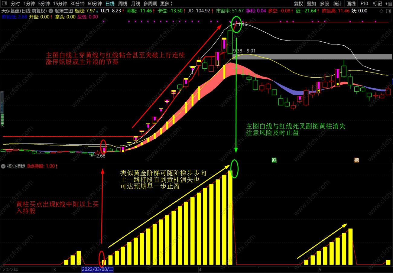 2,副图为通达信某尊享版核心指标,考虑好久才第一次现身网络,简单易懂易操作,类似黄金阶梯,黄柱出现,B点持股为1即可介入,卖点可傻瓜式操作,黄柱消失,B点持股归零卖出,做短线或超短线者可自由自主决断,盈利达预期即可,低位买点可选择主图K线穿越红蓝色带时,中位突破买点可选择股价上穿白线红线时,捕捉强势股或妖股买点可选择股价上穿黄线或黄白红线粘合时。