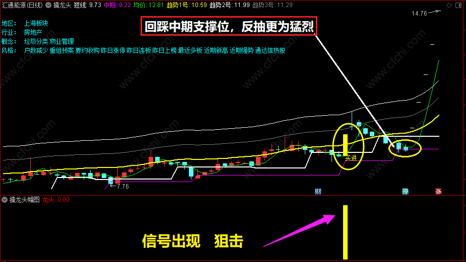 2、每日收盘中盘后都可选股,择机进场!可以结合着指标当中的短支撑(白色粗线)、和中期支撑(紫色粗线)