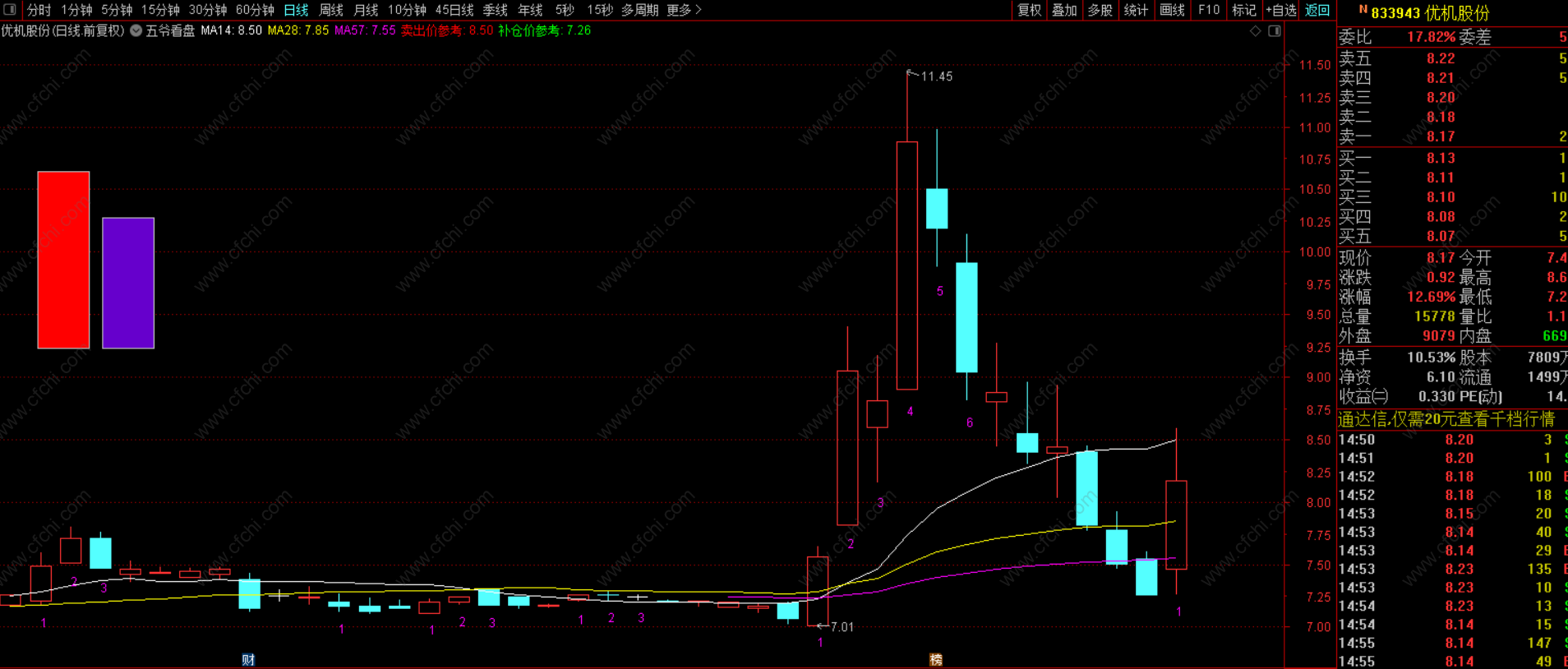 二:大K线,红色高于紫色,当天容易涨!否则容易跌!!涨跌停除外。
