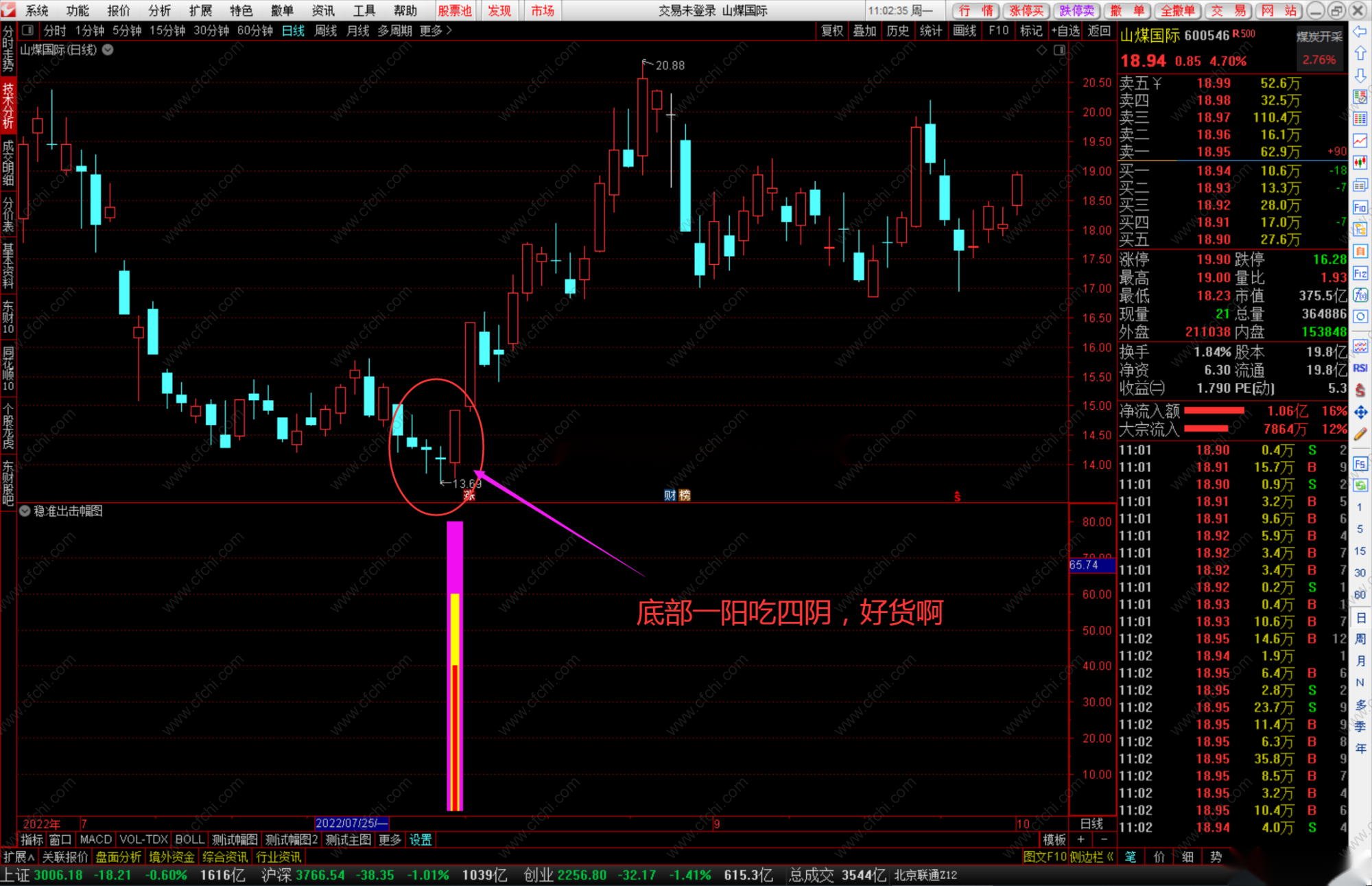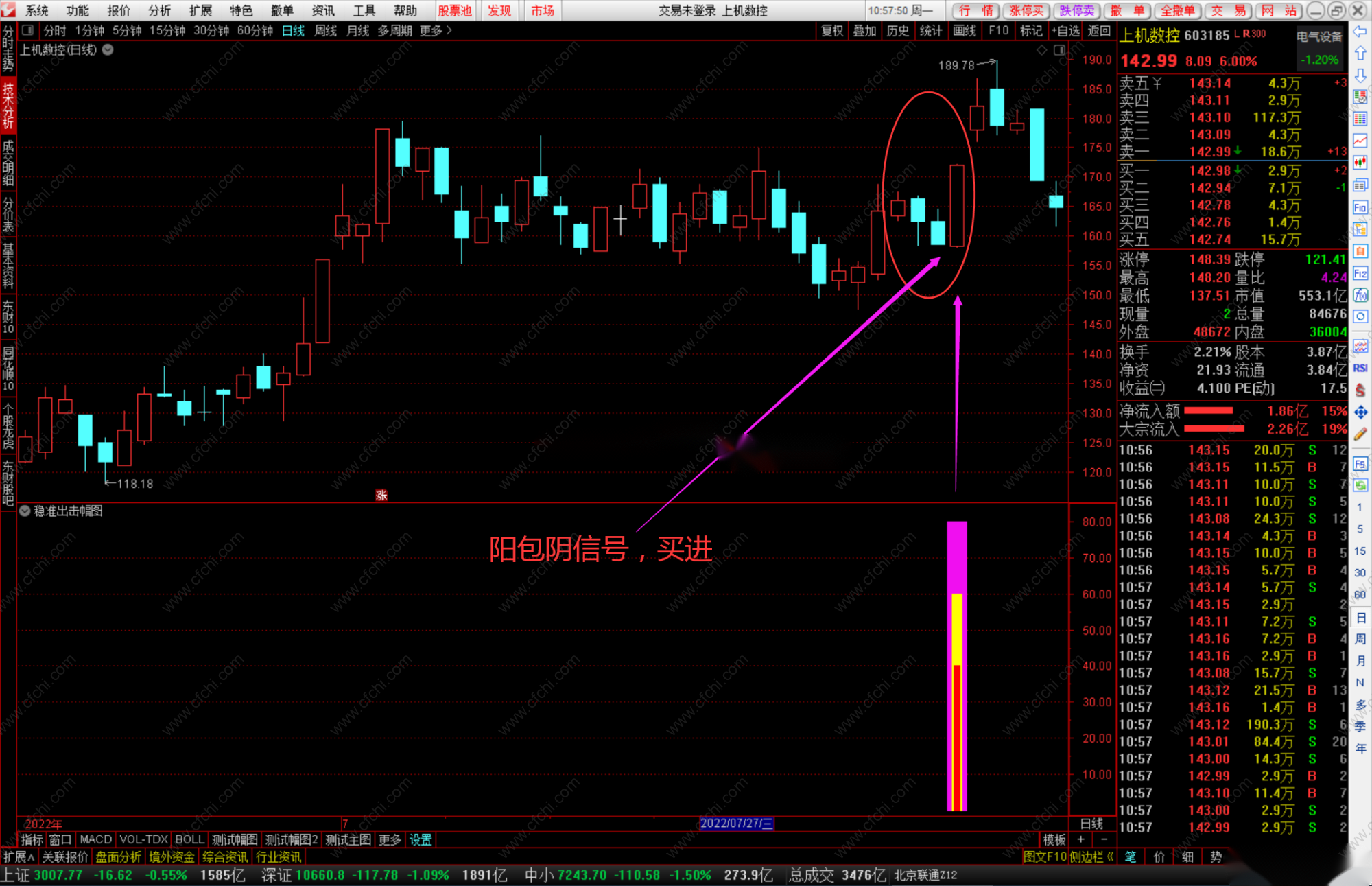 2、底部(长期下跌)出现大阳线,阳包阴信号,买进!