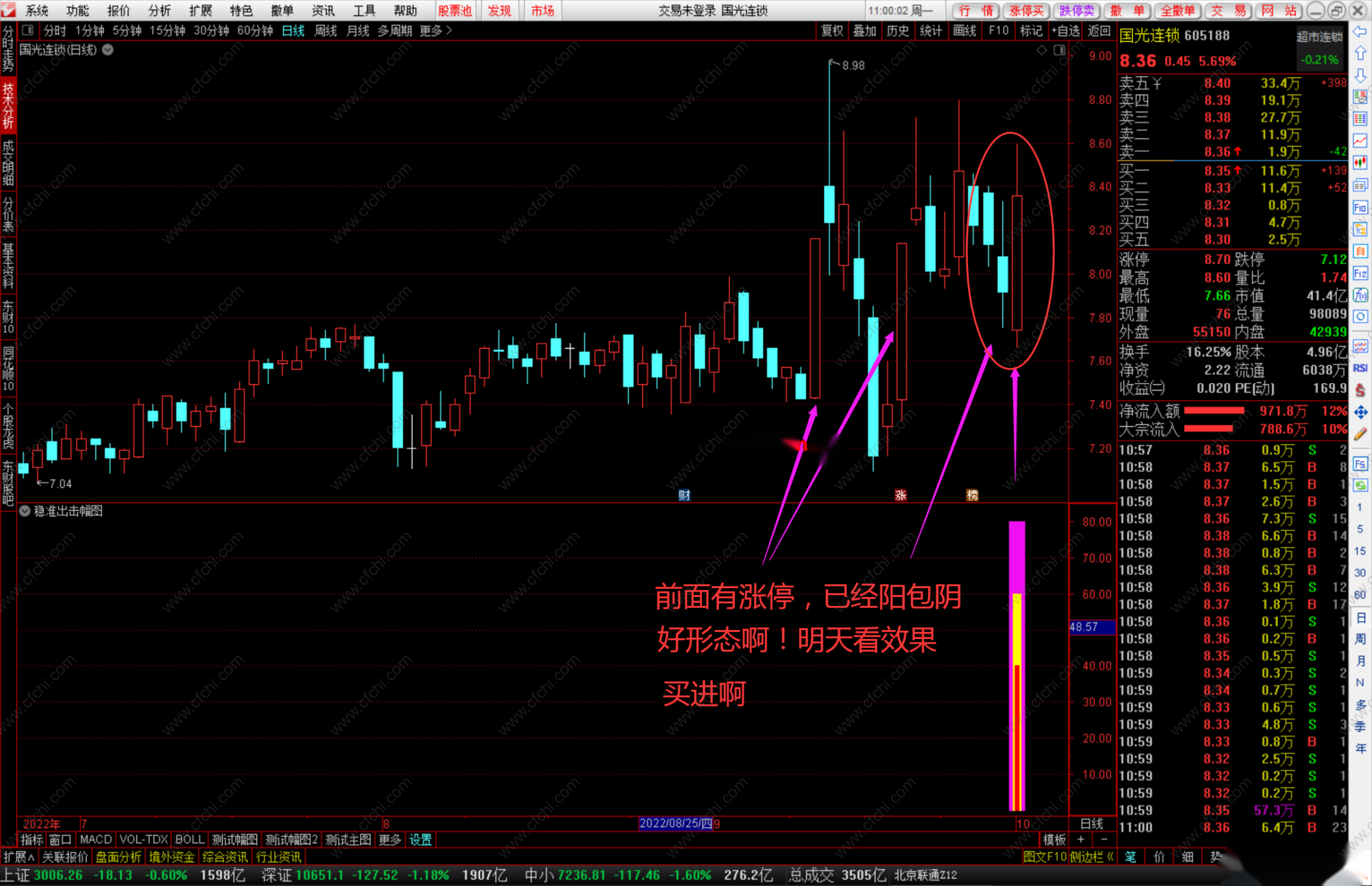 1、涨停突破平台后回调,出现阳包阴信号,买进!