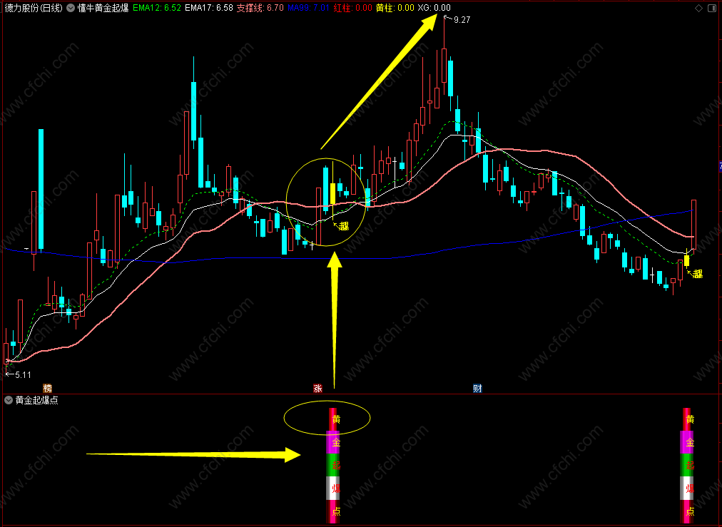 4, 黄金起爆点在股价低位发出信号,并且支撑线由走平开始微微上拐,并股价站上支撑线,可大胆介入。