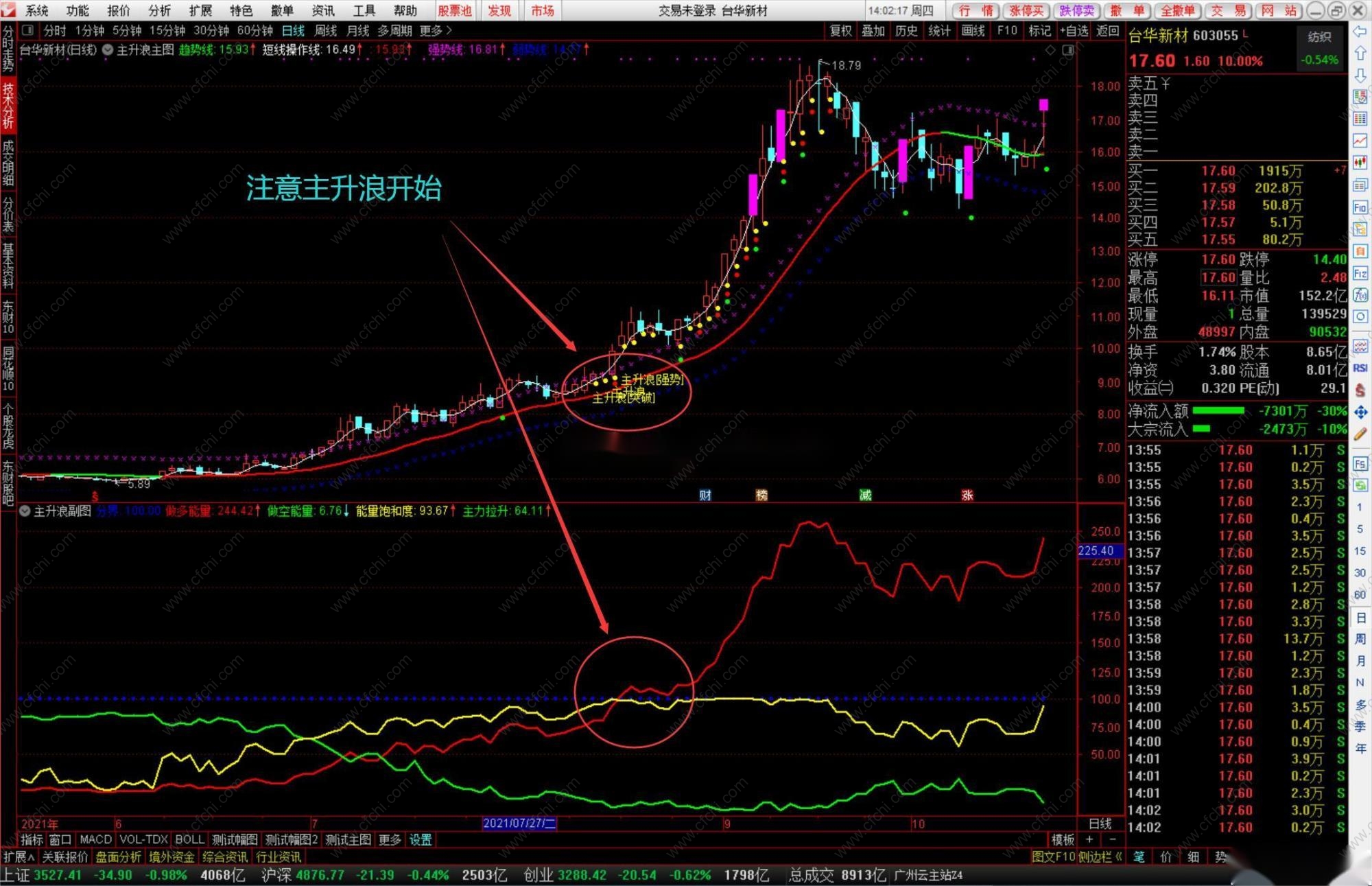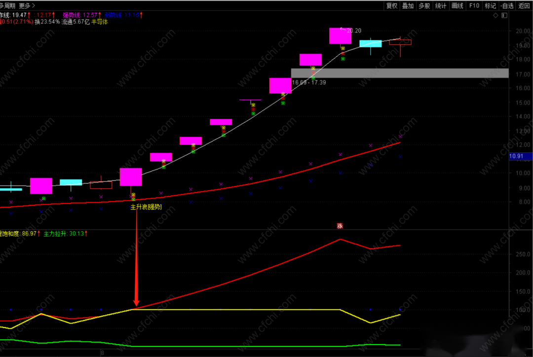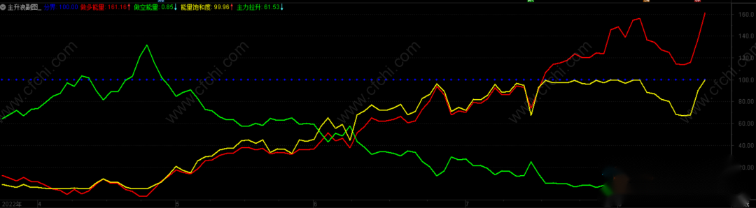3.主升浪强势:代表处于主升浪的个股做多能量线向上突破分界线,股价会加速上涨。