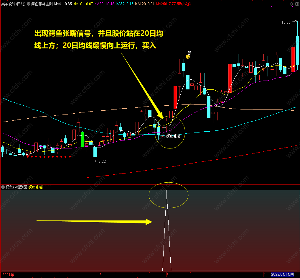 出现鳄鱼张嘴信号,并且股价站在20日均线上方;20日均线缓慢向上运行,买入