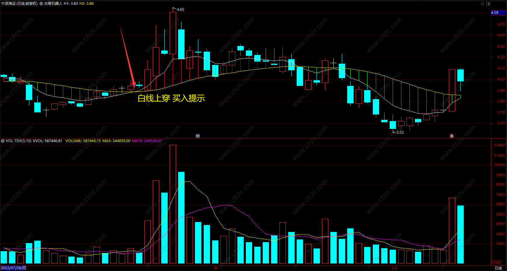 1、交易机器人指标主图指标,白线上穿代表上涨;