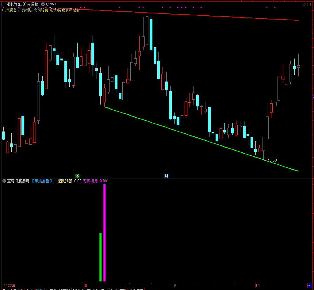 海底捞月:适用于短线急跌后快速反弹点位提示,绿色柱体为大阴预警,紫色柱体为介入提示