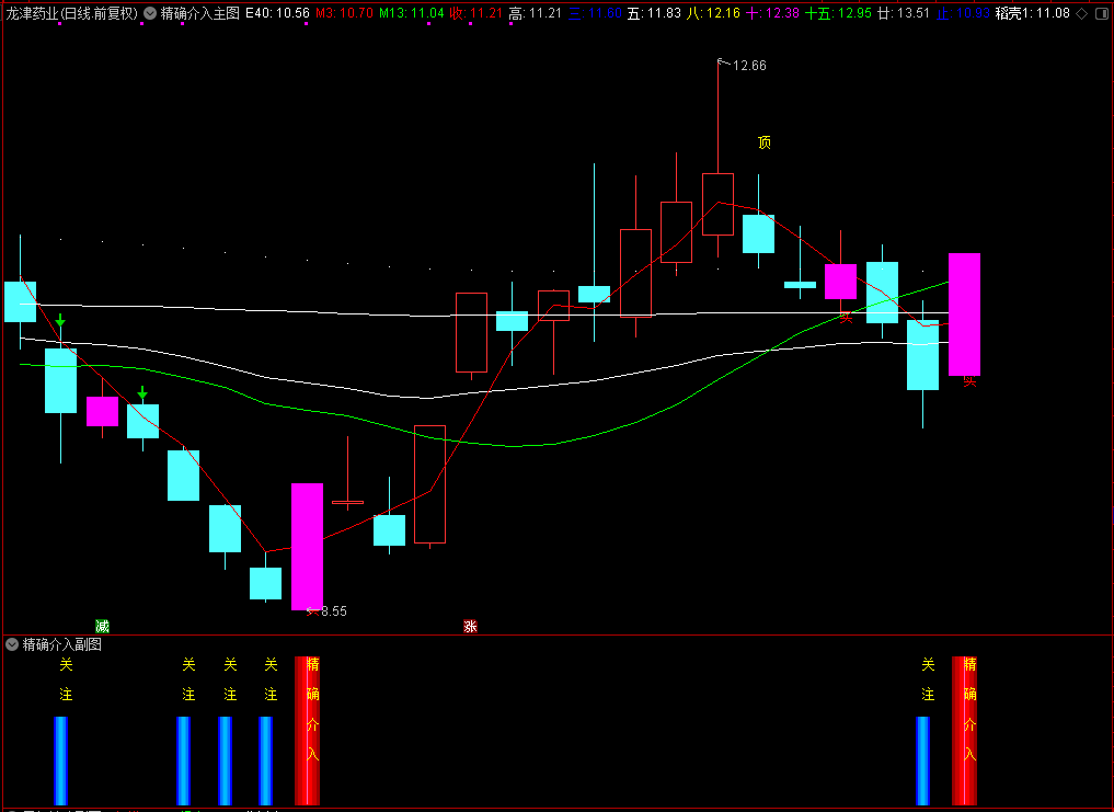 精确介入指标选择3日线拐头向上的股票操作,线上回调阴线买入。实盘操作中结合主图选择均线多头排列的个股,再根据精确介入副图指标信号设置预警关注择机买入。