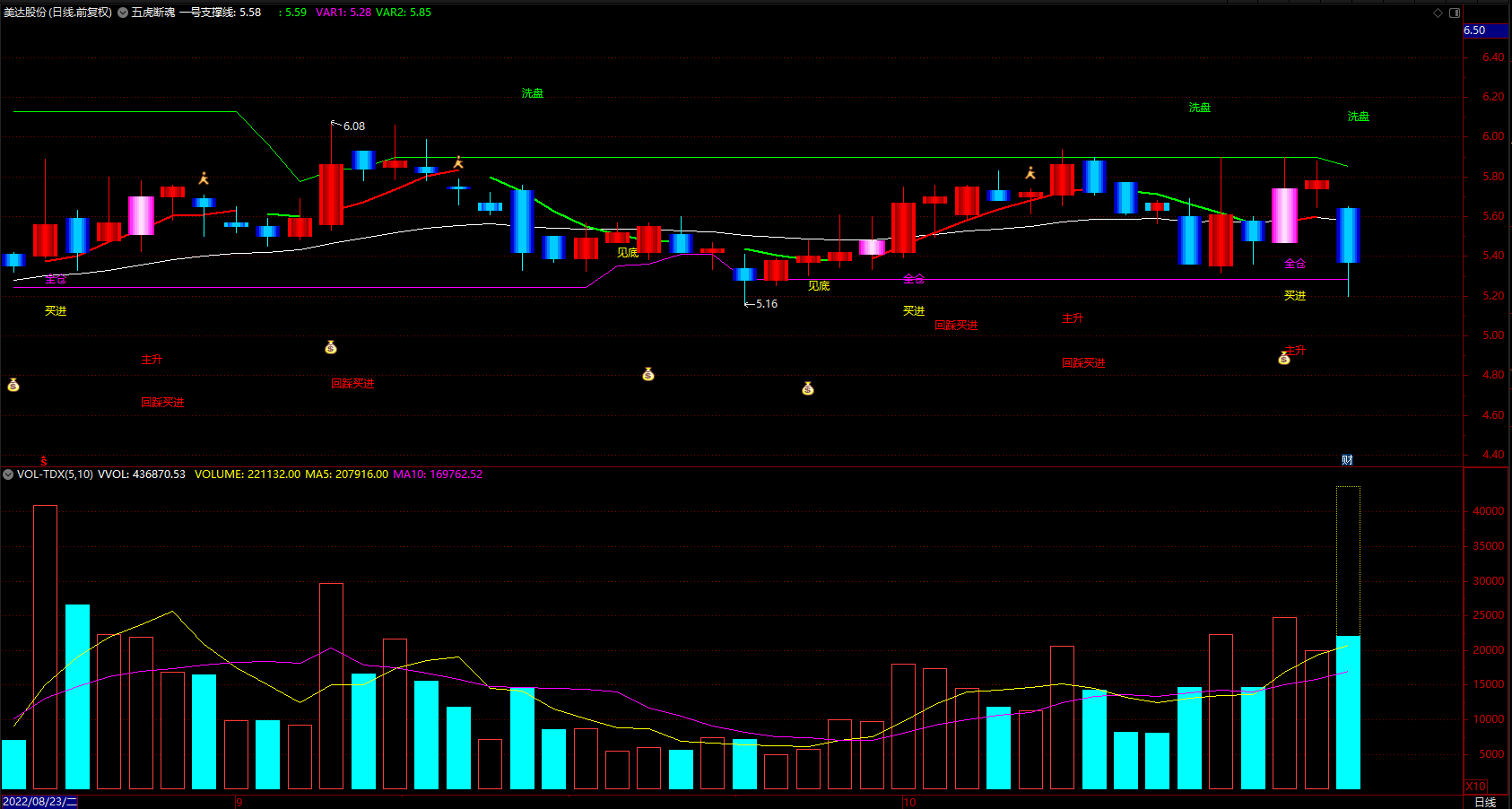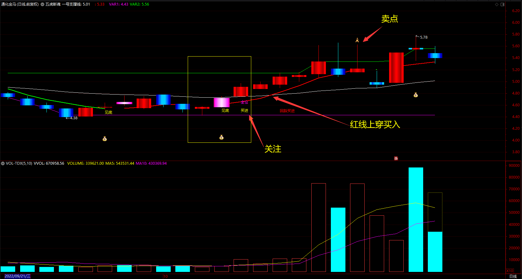 买点:红色线“钱袋子”“见底”“买入”“全仓”这些都可视为买入信号
