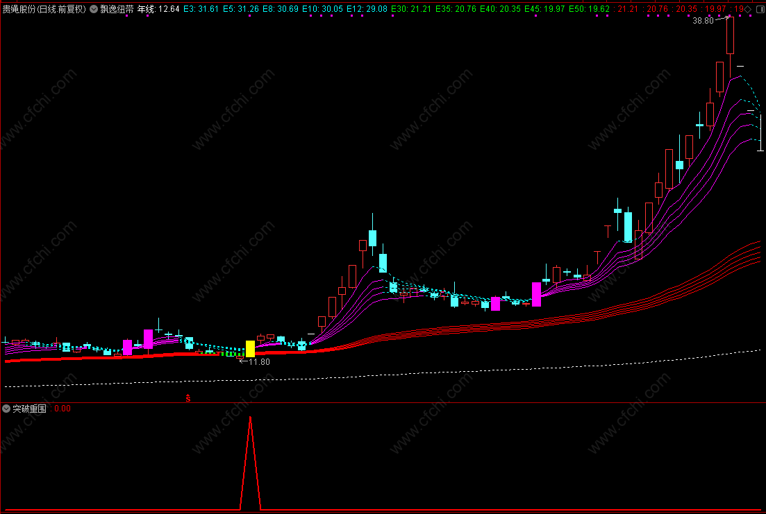 指标包含:飘逸纽带(主图)、突破重围(副图)+选股