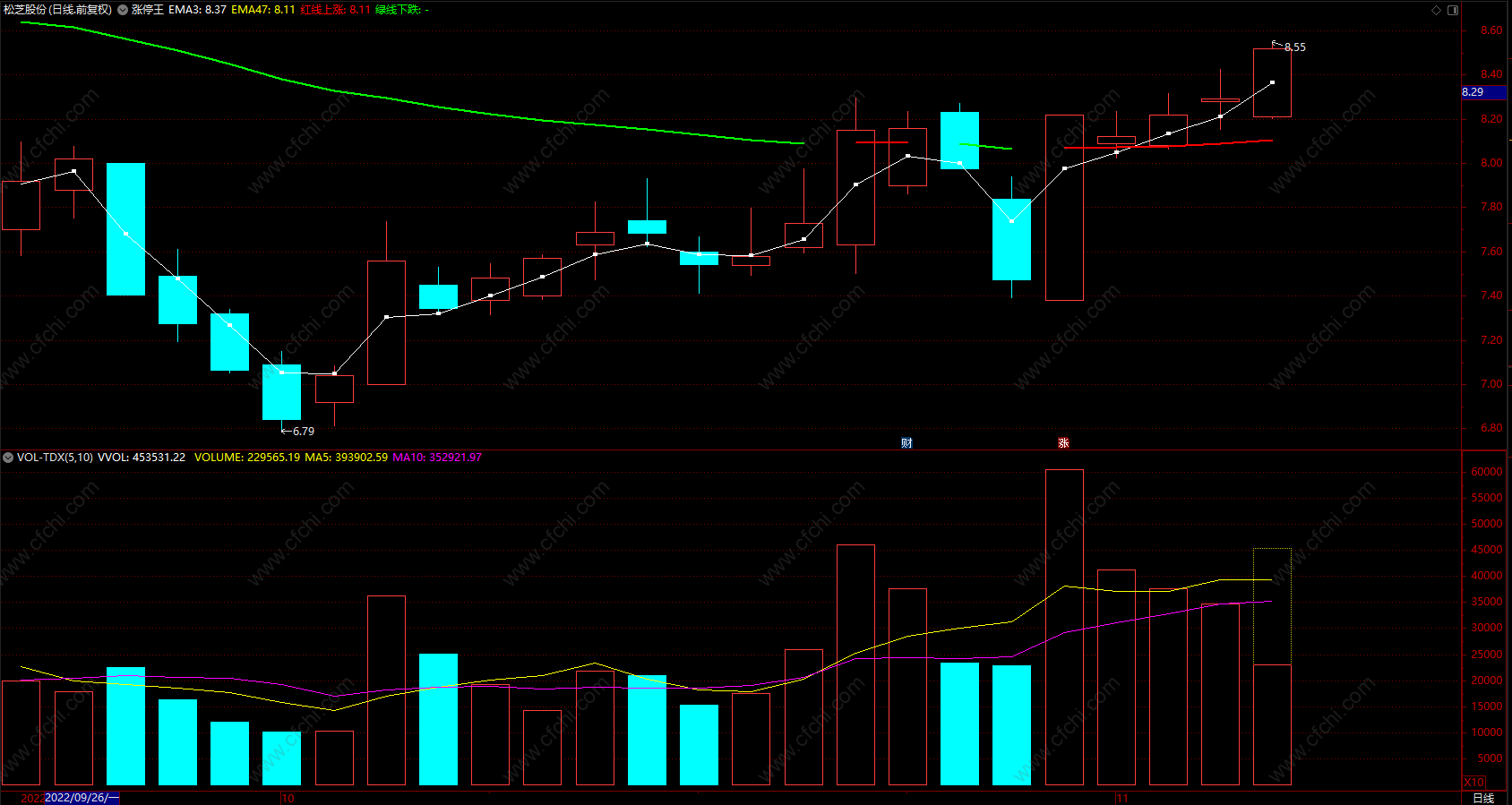 绿线下跌:IF(EMA47<=REF(EMA47,1),EMA47,DRAWNULL),LINETHICK2,COLORGREEN;