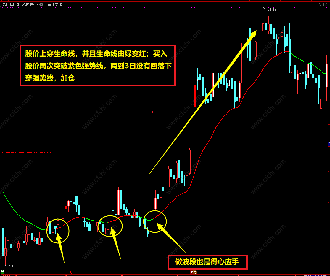 转强信号:价格上穿生命线,同时生命线由绿变红。