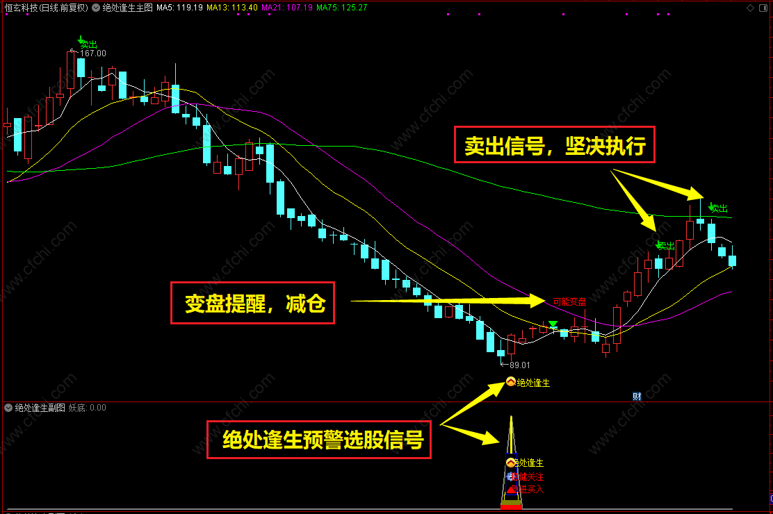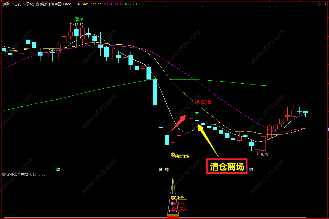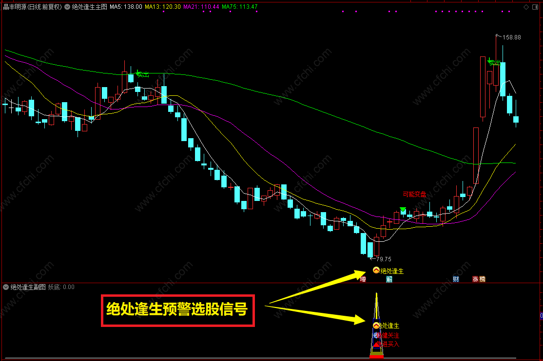 【绝处逢生指标】由:主图+副图,预警选股指标,共3个指标。