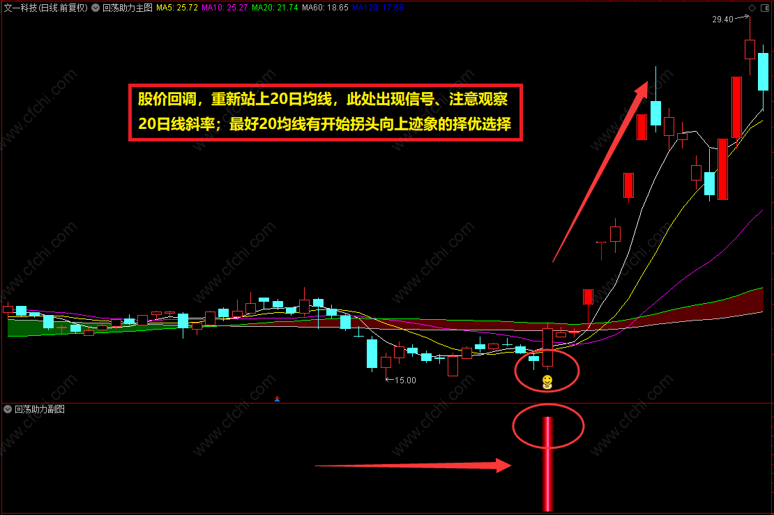 股价回调、并重新再次站上20日均线,此处出现信号、注意观察20日线斜率;最好20均线有开始拐头向上迹象的择优选择