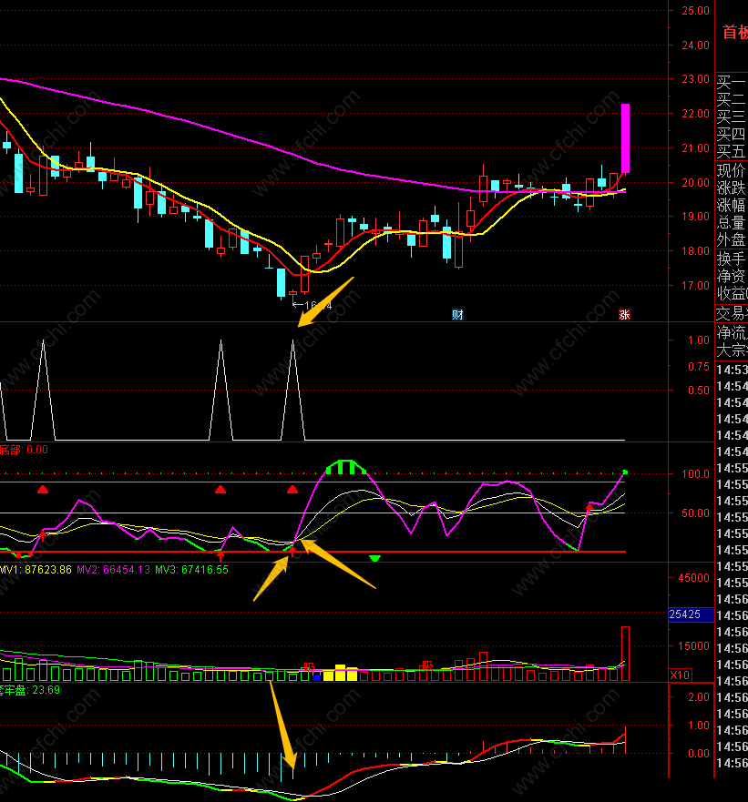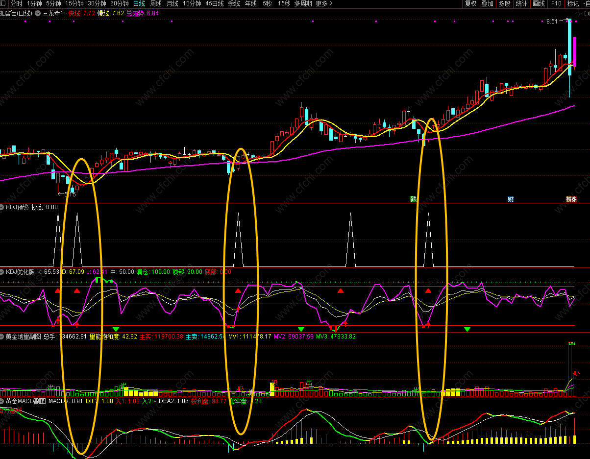 B、黄色量能饱和度:出现此信号,代表此时推动股价的资金量刚刚好,不同流通盘的股所需的资金量可以测算!