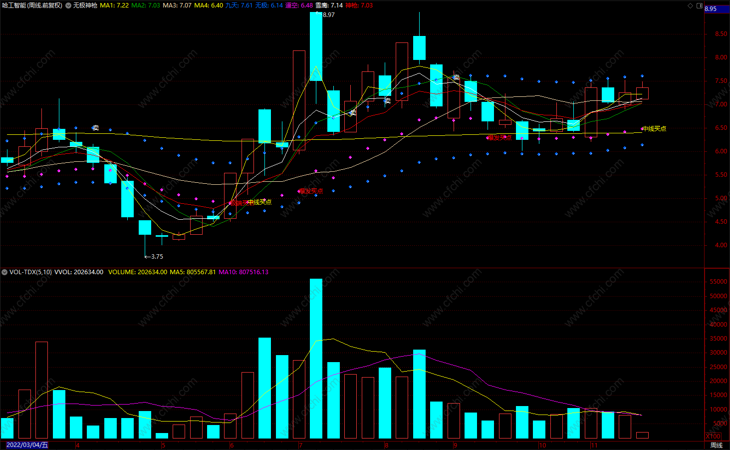神枪: IF(MA(VOL,3)>MA(VOL,5)>MA(VOL,9),SMA(CLOSE,3,1),SMA(CLOSE,5,1)),COLOR0000FF;