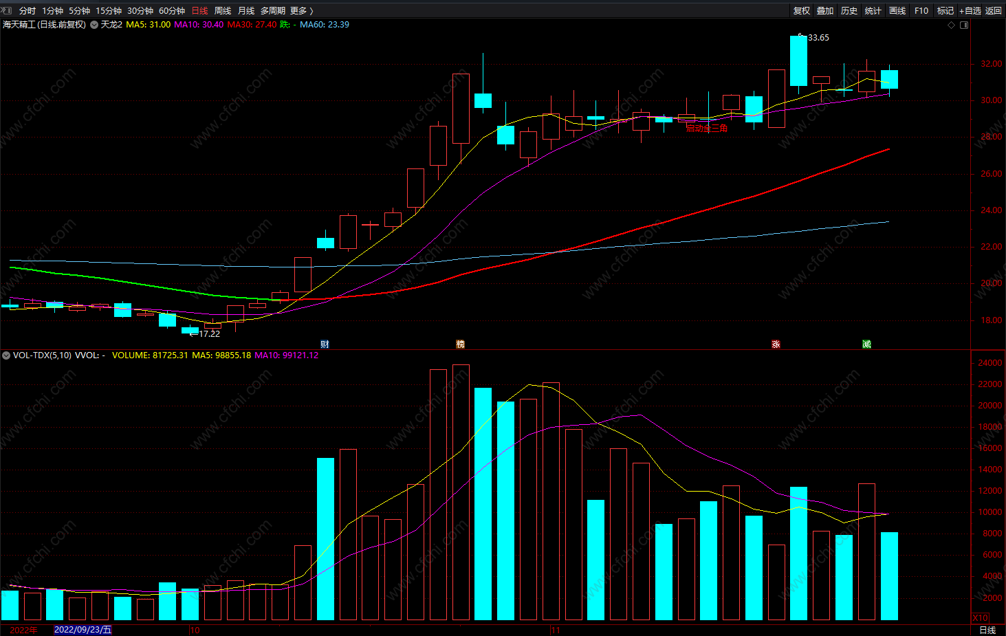 跌:IF(MA(CLOSE,30)<=REF(MA(CLOSE,30),1),MA(CLOSE,30),DRAWNULL),COLORGREEN,LINETHICK2;