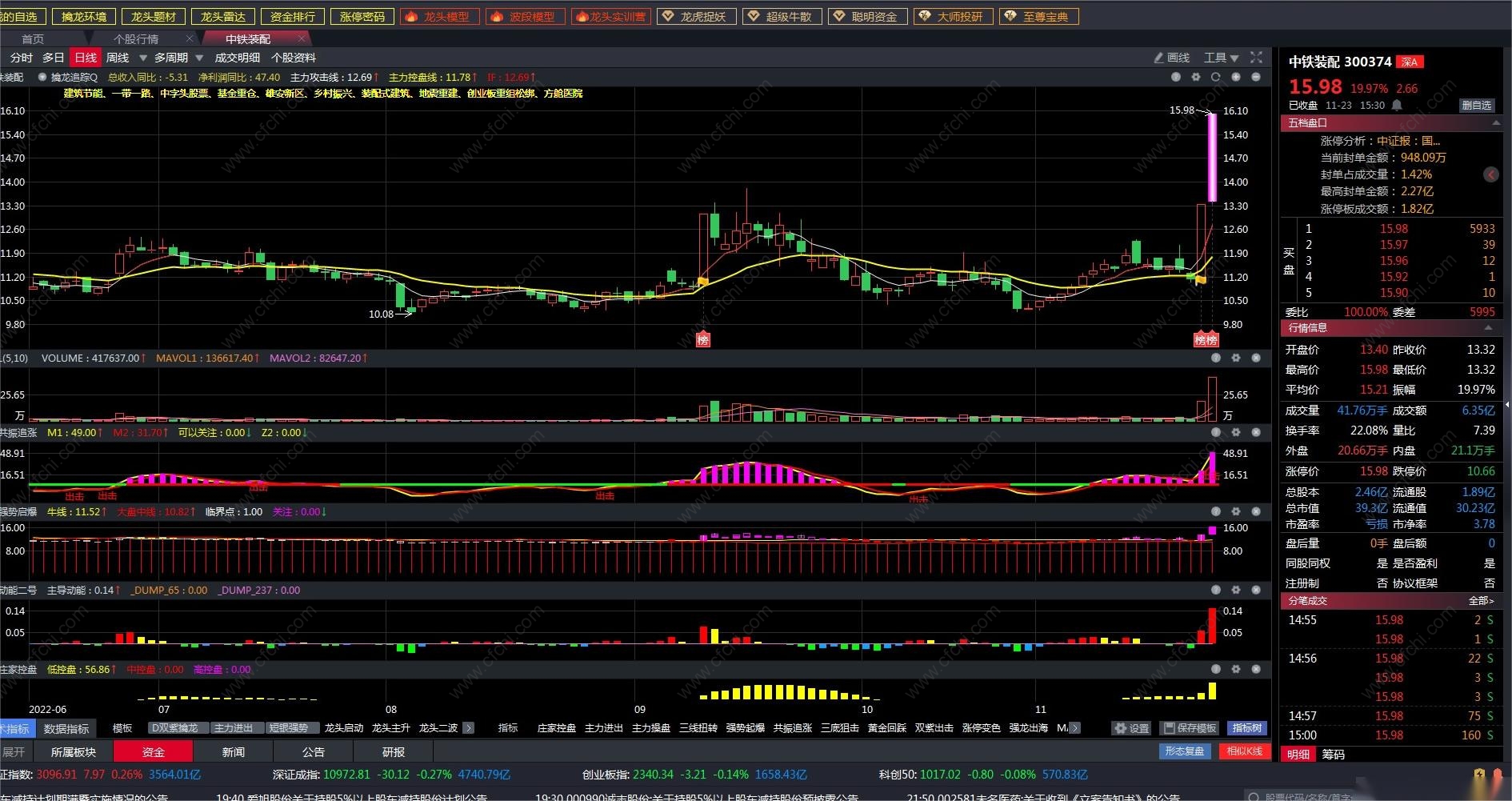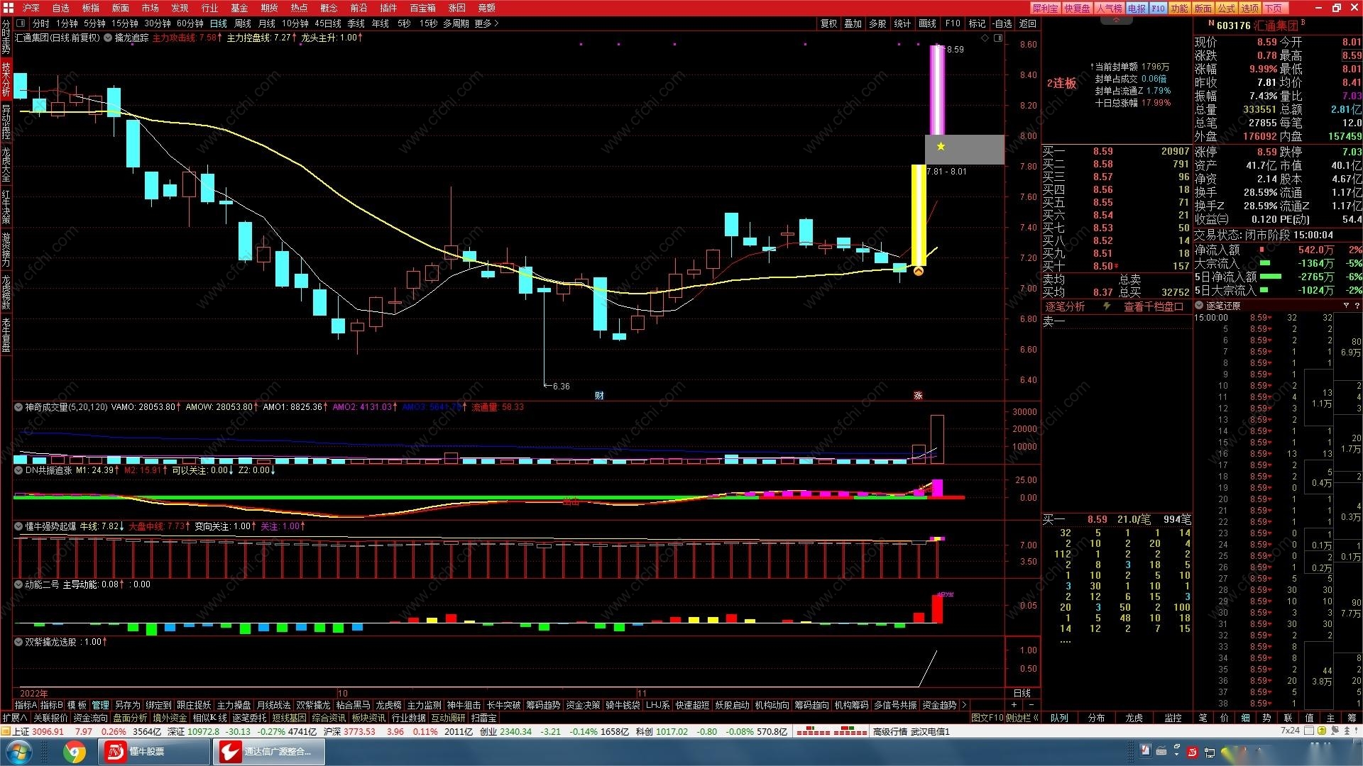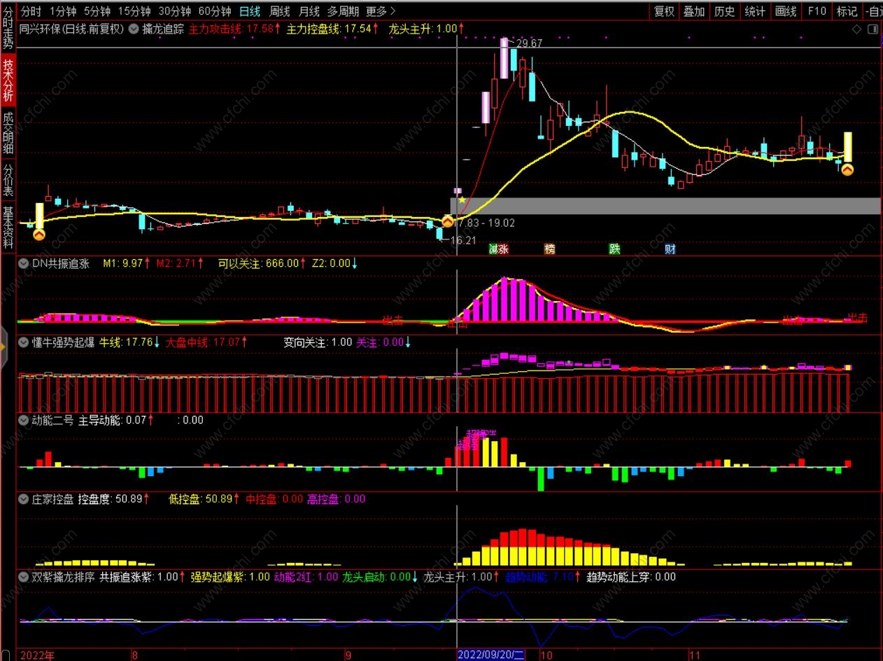 双紫擒龙战法,一个主图指标为擒龙追踪,4个副图指标为共振追涨、强势起爆、动能二号和庄家控盘, 均为通达信版,开放源码,无未来函数,所有副图指标与原版软件指标的数据丝毫不差,见图例;主图指标擒龙追踪属个人仿版,龙头启动和龙头主升信号与原版不完全一致,但大部分一致(2/3),一个排序指标(在行情排序里,几个选股信号可以组合排序),一个主升选股指标(以后会升级,陆续增加一些用户需要的选股,一次下载后续可以免费使用),今天都分享给有缘人,看好的才下载,不看好的请匆下载,以免浪费,勿拍砖。懂牛的自然懂,祝您天天擒龙骑牛!