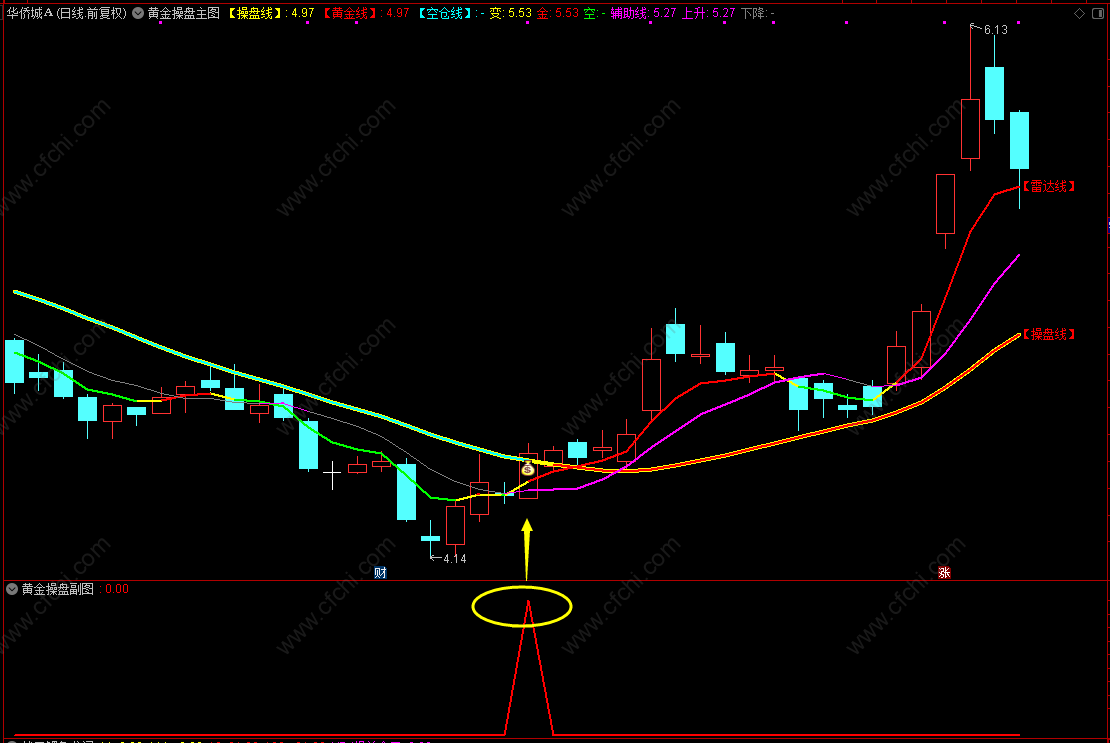 信号出现位置,最好股价站在操盘线之上,并且操盘线由兰色转为黄色、由下降趋势开始转变为走平或者开始微微向上拐头,为很好的介入时机。