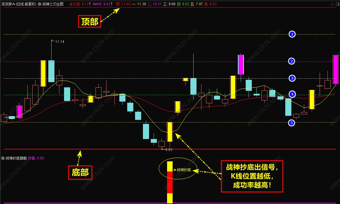4、【战神出击+抄底】选股信号出现后,一定要信号所在主图位置,1-5号线,信号位置越低越安全,高位信号不参与。