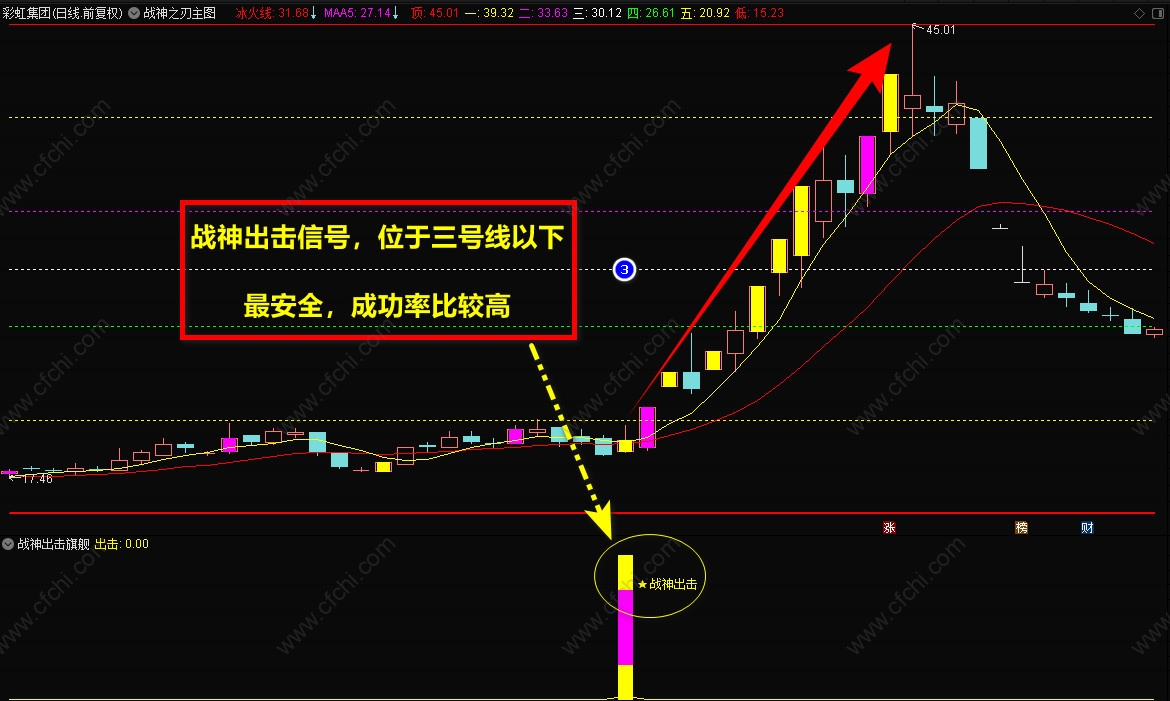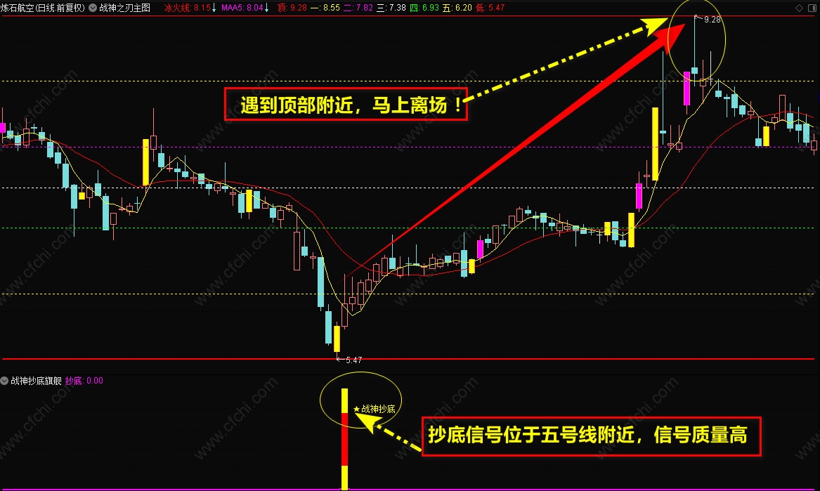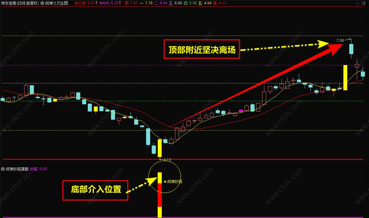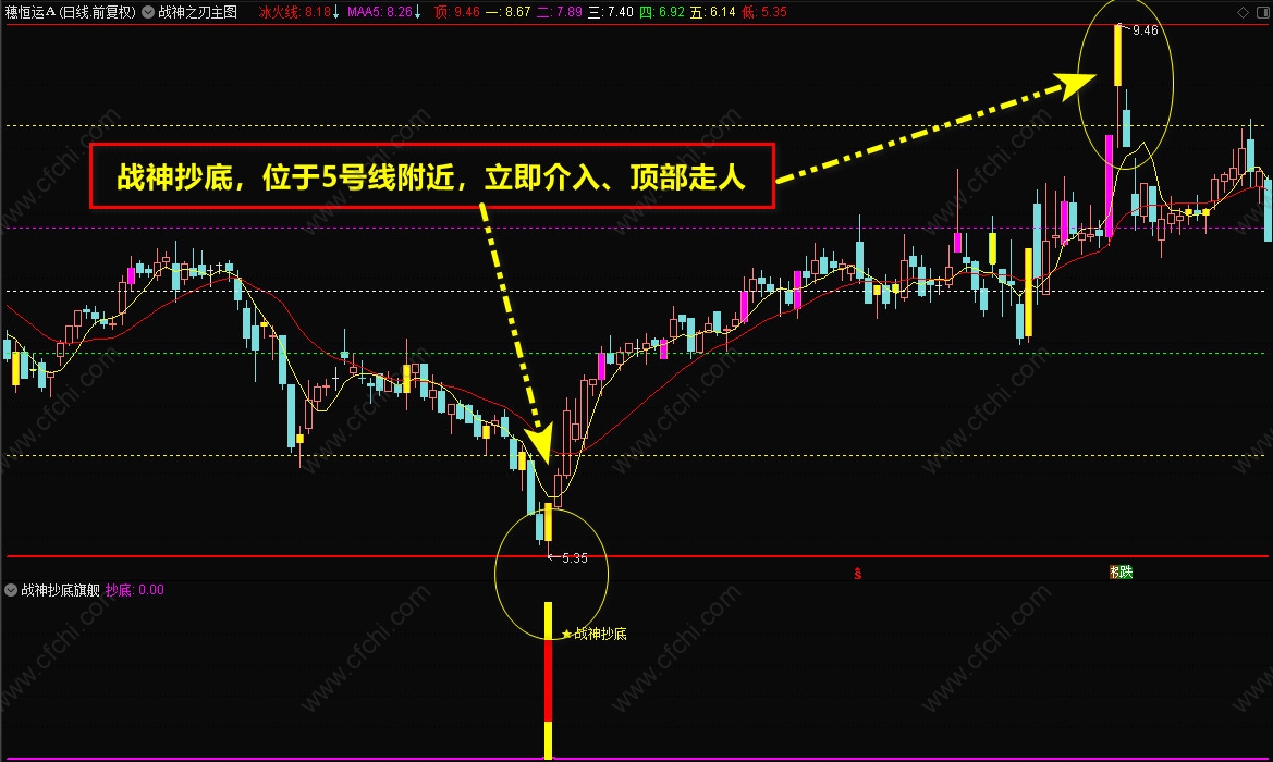 3、【战神抄底】选股指标,一般是盘后选股,信号出现后,最好在底部,【战神主图】的5号线附近,短线介入,持股到顶部卖出。