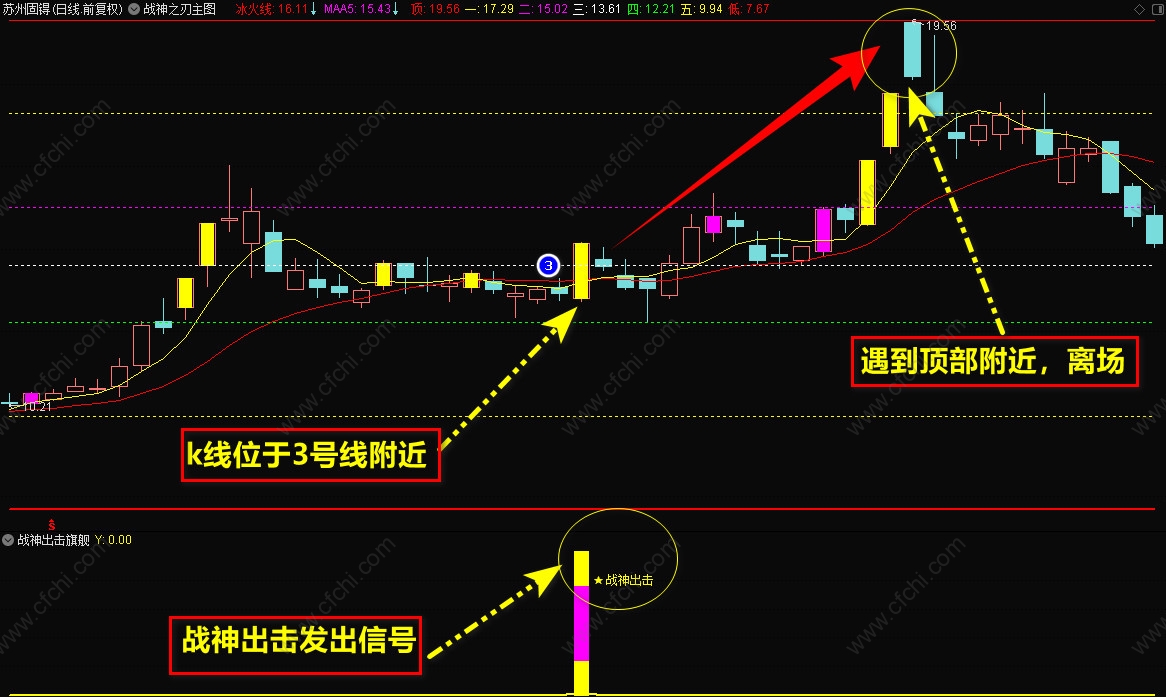 2、【战神出击】选股信号、最好在三号线附近买入,结合分时图,低位介入更好,后期会有不错的涨幅,可以在红色线附近止盈离场。
