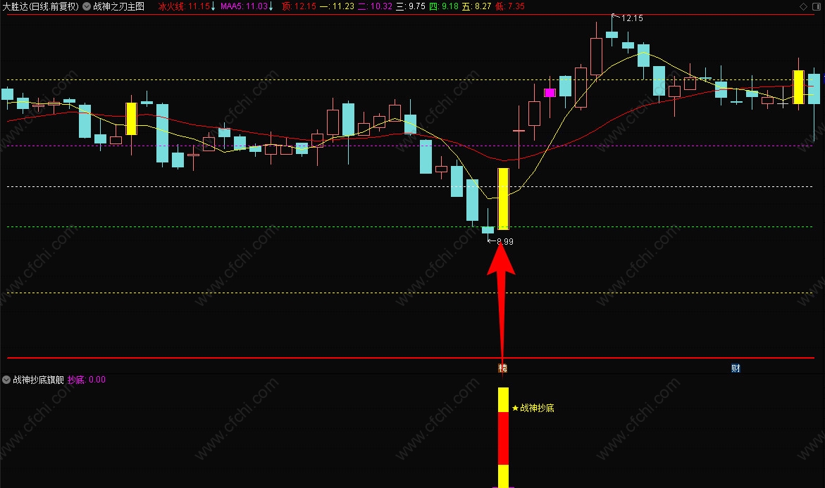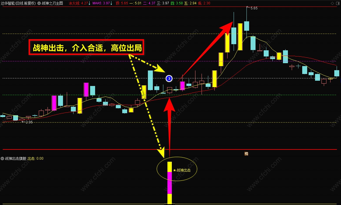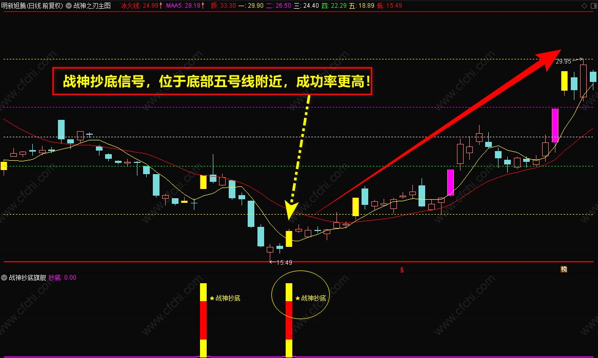 3、【战神抄底】选股指标,一般是盘后选股,信号出现后,最好在底部,【战神主图】的5号线附近,短线介入,持股到顶部卖出。