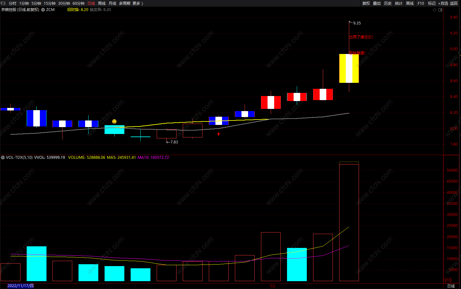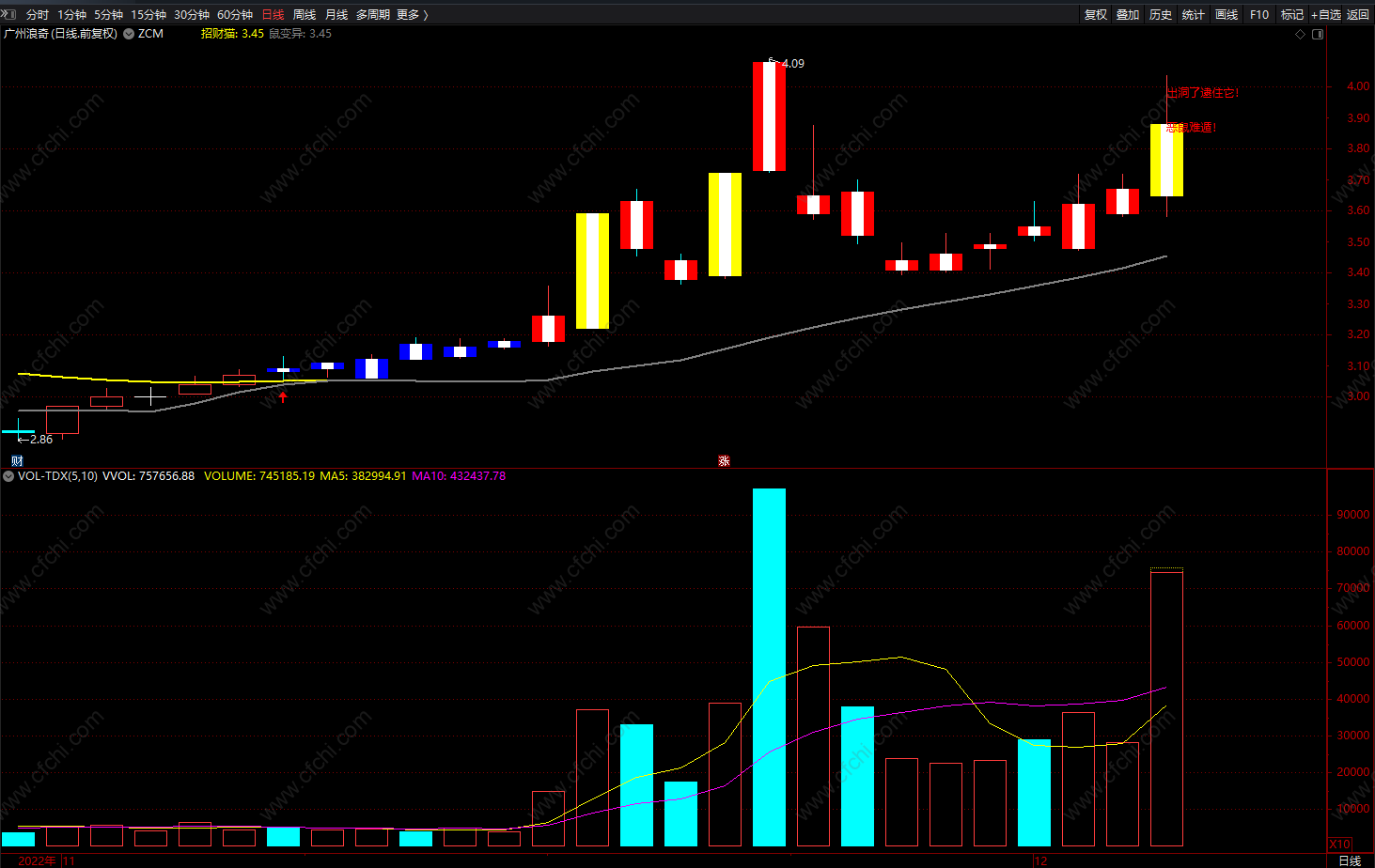 DRAWTEXT(C>0 AND T2>0 AND ISLASTBAR,K2-E,'鼠玩猫守着它!,'),COLORFF7700;