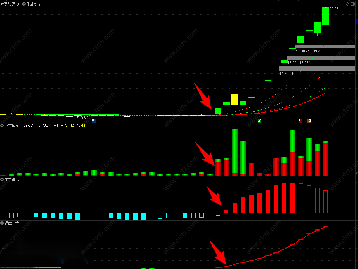 2、当主力占比为红色区域时,由红色空心柱体转为红色实心柱体,说明主力洗盘完毕,即将进一步拉升;