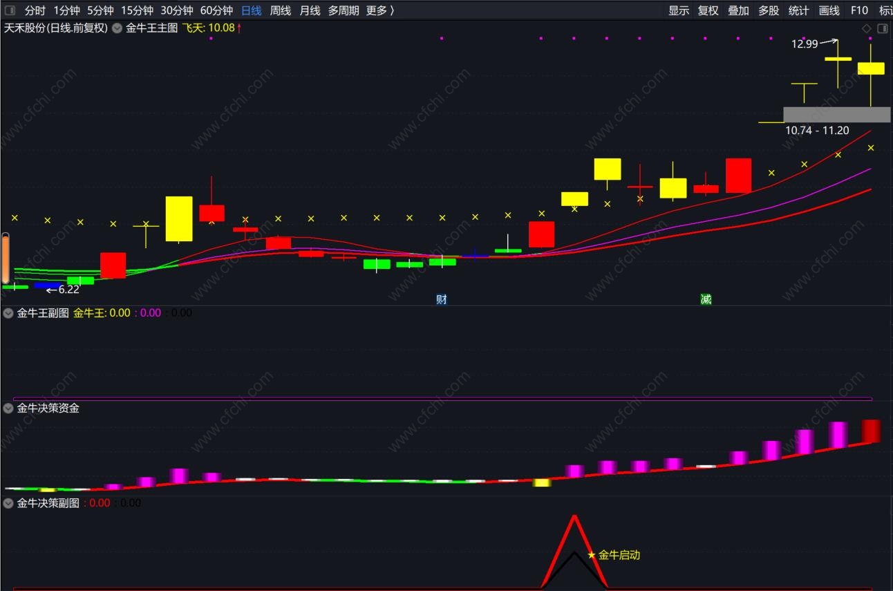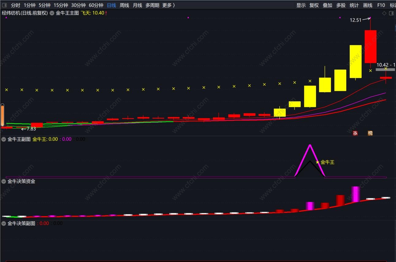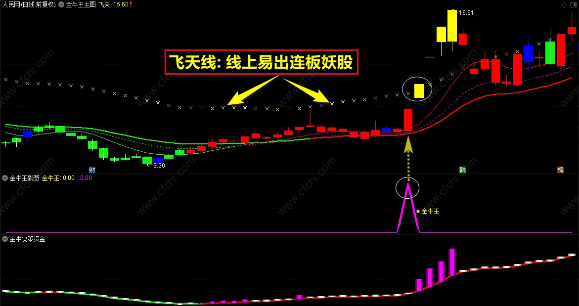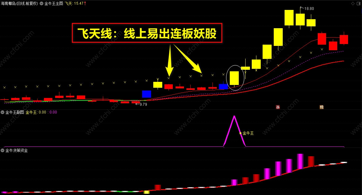 1、金牛王主图:在原来主图基础上增加了:飞天线,线上易出大牛股,如果两三个交易日,不上飞天线,就清仓。