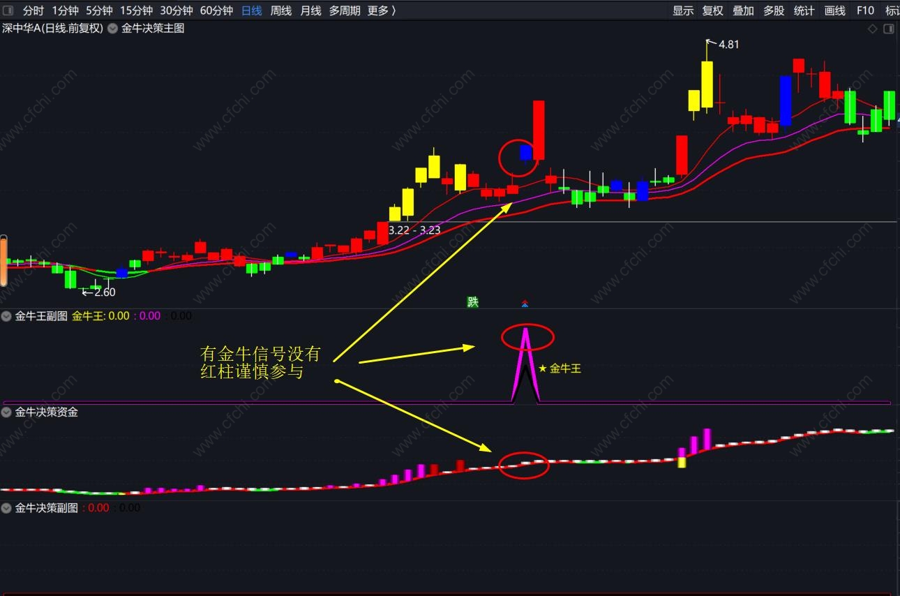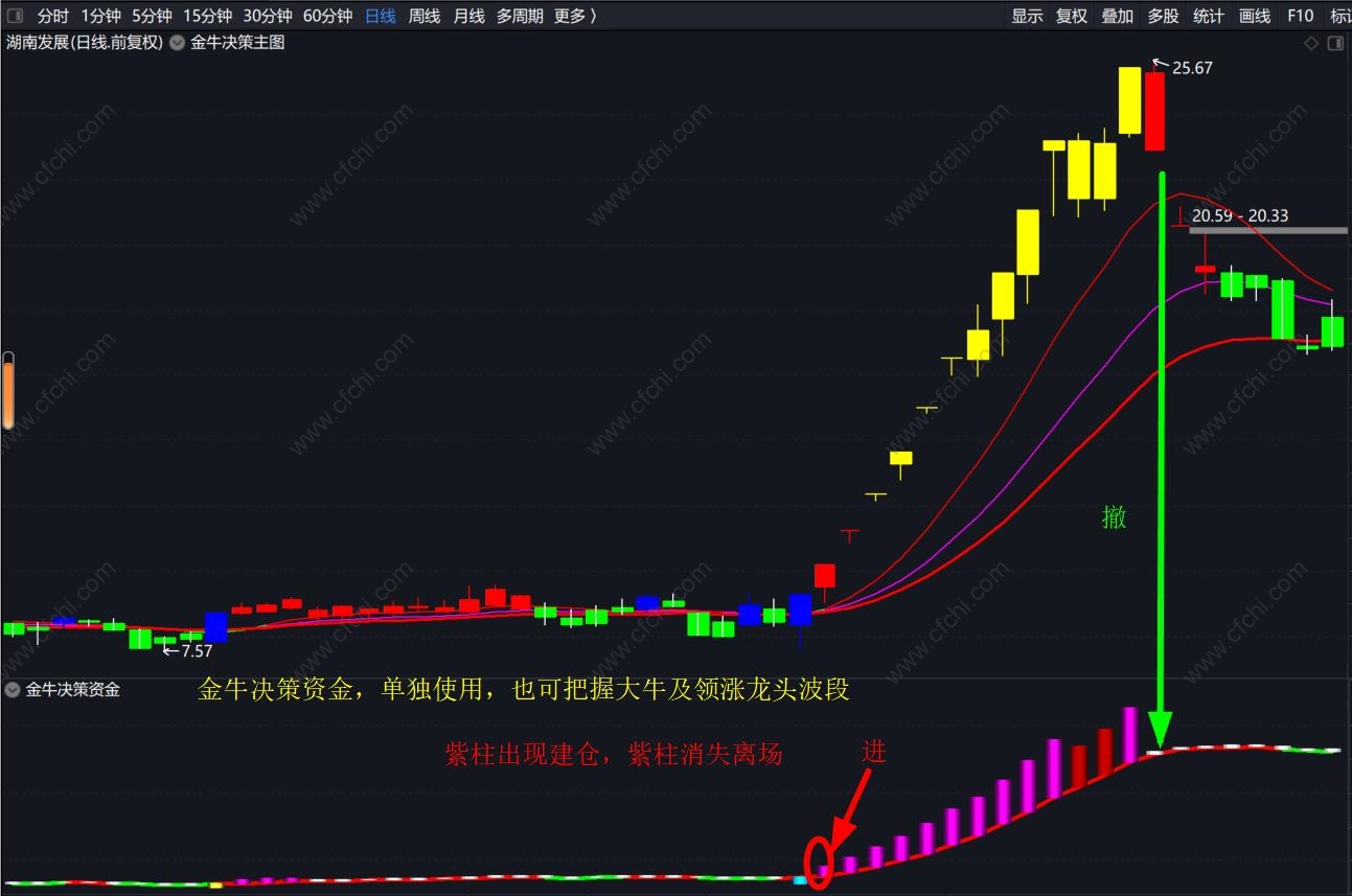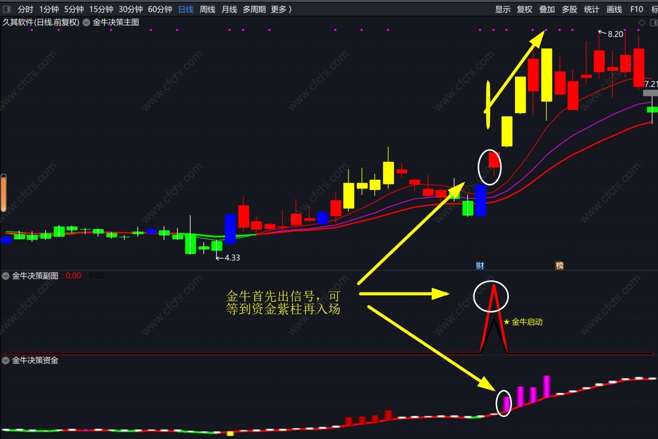 1、【金牛决策资金】由向下的黄柱、绿柱,向上的紫柱、红柱组成,专门用来提示资金异动,把握短期市场变化。