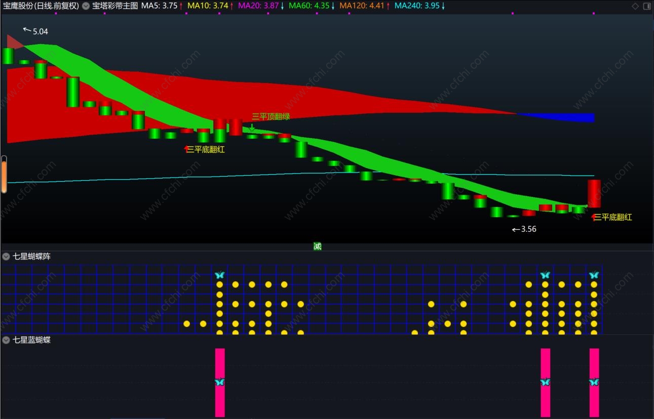 | “七星阵”。看看附图效果。 买入信号明显, 蓝蝴蝶买入信号,红蝴蝶持股。红蝴蝶消失逃跑。是不是很有意思。 宝塔彩带主图,包含均线彩带和宝塔线彩色K线,向上红箭头加宝塔线翻红提示买入,绿色向下箭头加宝塔线翻绿提示卖出,也可低位绿K转红K或半红K买入,高位红K转绿K或半绿K卖出,简单有效无未来易懂好操作。 七星蓝蝴蝶副图/选股,出信号如果比较多,可结合主图的买点提示做共振优选,很好用的。 |