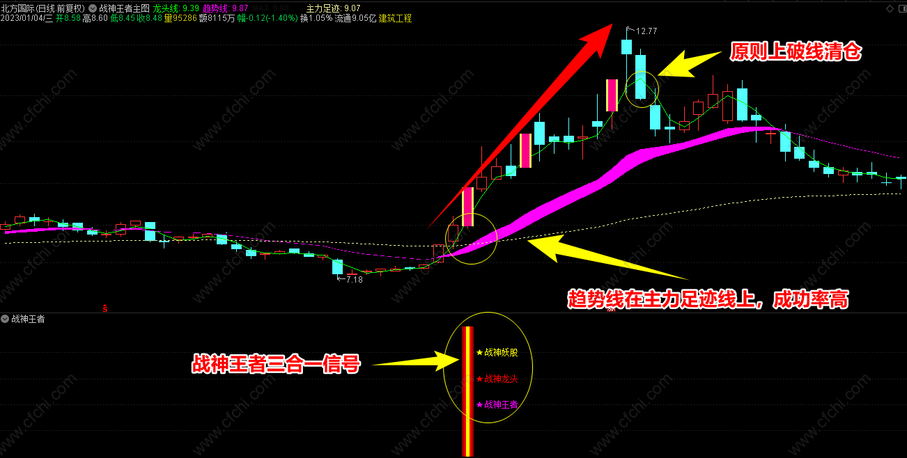 战神王者主图指标由龙头线、趋势线、主力足迹线没组成;
