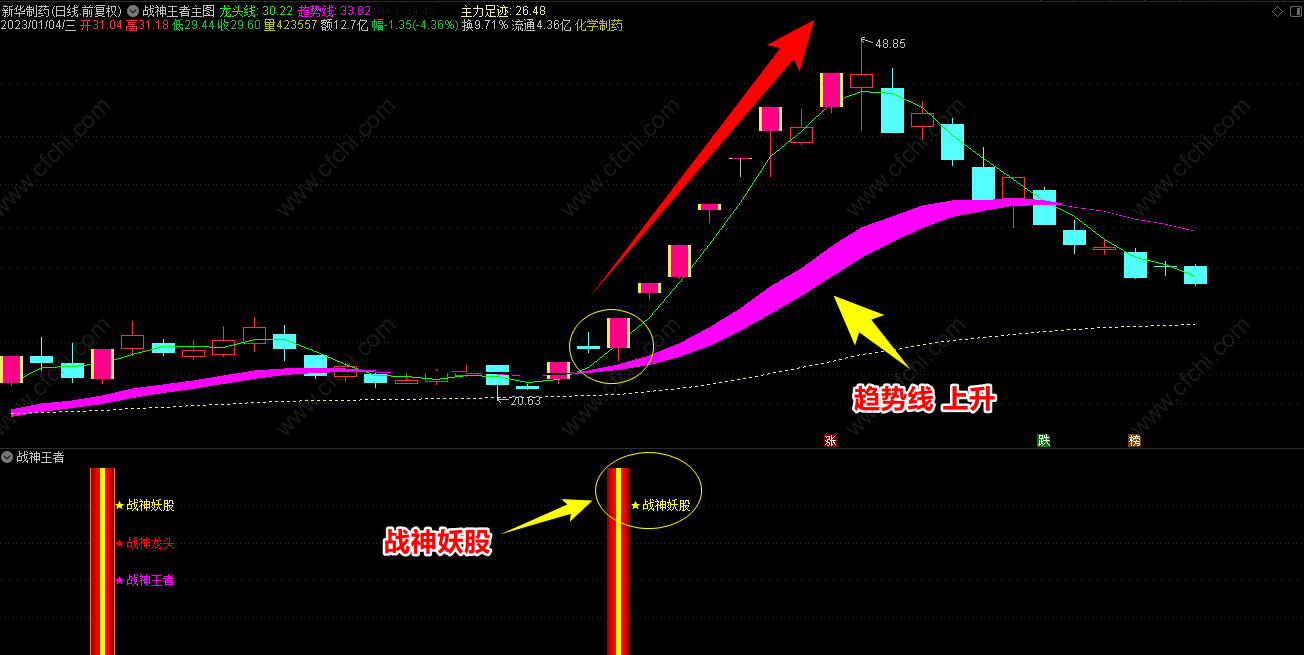 实战中主图指标中紫色趋势线拐头向上,线条逐渐变成粗色的紫色带表示个股进入上升趋势,只要股价不跛趋势线就可一路持股待涨;