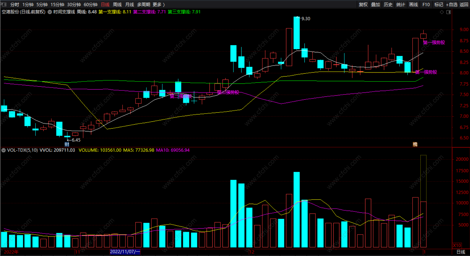 3、第二强势股的特征是:跌破第二支撑线后短时间上穿之(不跌破第三支撑线);