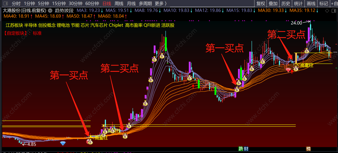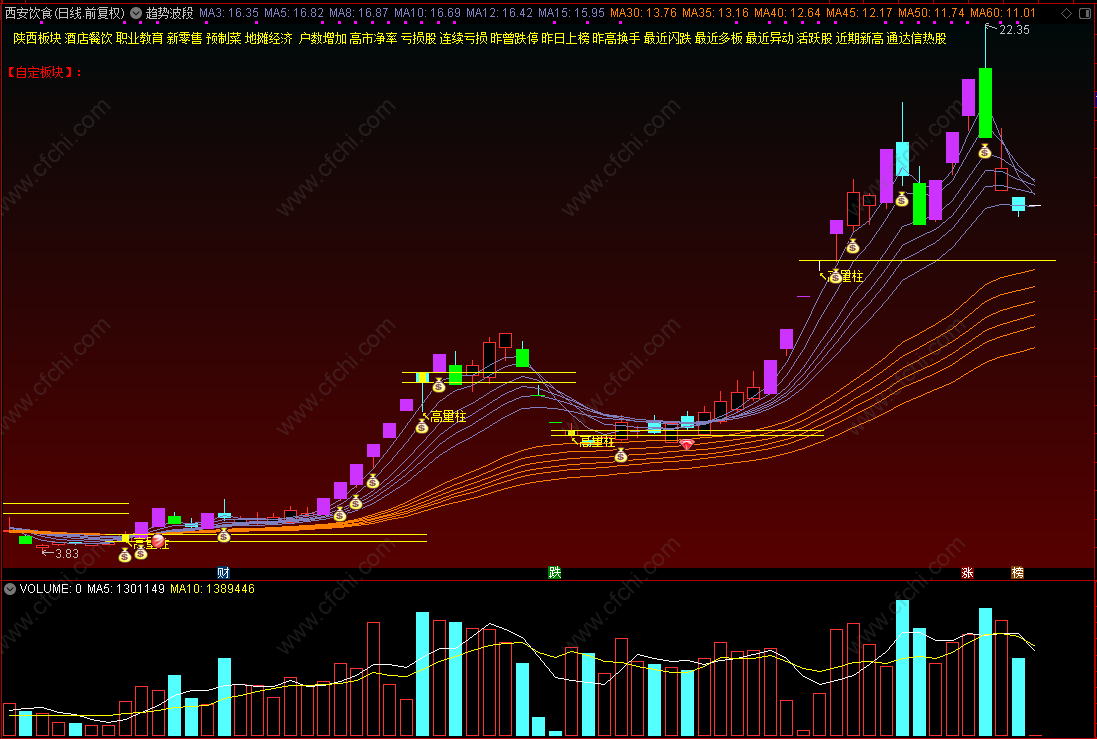 1、淡紫色是短期均线,橘色是中期均线,当两种颜色的均线逐步粘合且短期均线上穿中期均线时,择机进场;