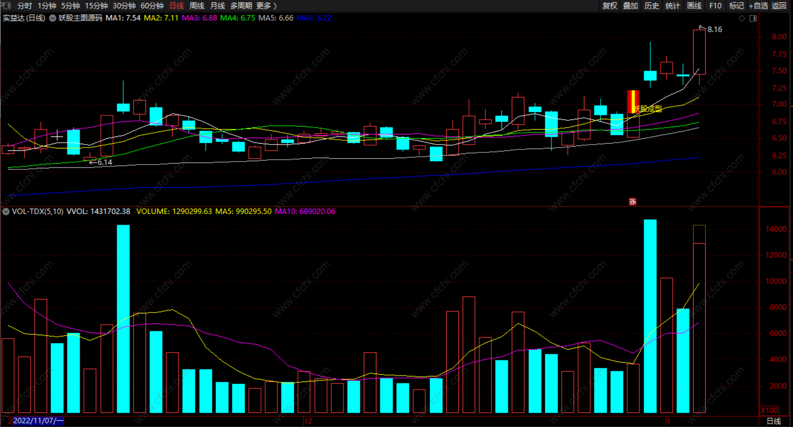 DRAWTEXT(X_11 AND CLOSE/REF(CLOSE,1)>1.08,REF(CLOSE,1)*1.058,'妖股成型'),COLORYELLOW;