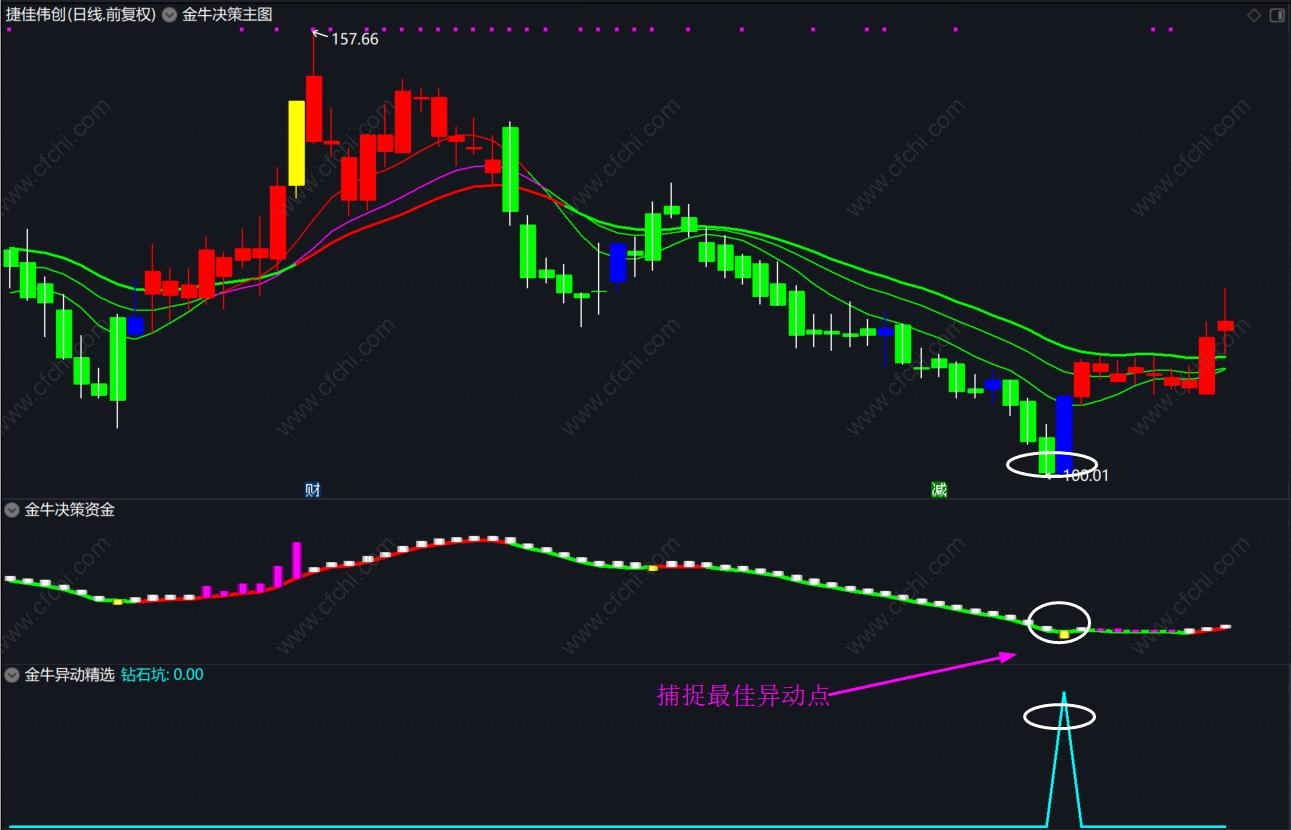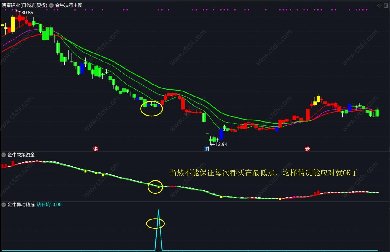有的人喜欢追涨,认为追高刺激,短线回报率大,利润也大,但风险也大,几乎每个人都试过追涨停过后被按在地板上摩擦的那种痛,损失也许不大,但侮辱性很强,有的人认为,低吸很安全,大不了就是三五个点回撤,但一旦涨上去了收益还挺多,所以大部分投资者都认为低吸才是最好的选择。追高靠勇气,低吸凭耐心。不同的性格有不同的操作手法。追高的你心理慌吗?本套指标就秉承低吸的思路,在经典黄金钻石坑指标的基础上,捕捉它与金牛决策资金异动点的共振,非常精准稳健,低吸指标的又一个典范,低吸富三代,以后就应该这样低吸!开源节流只是基本要求,抓住机会才是赢家重点!