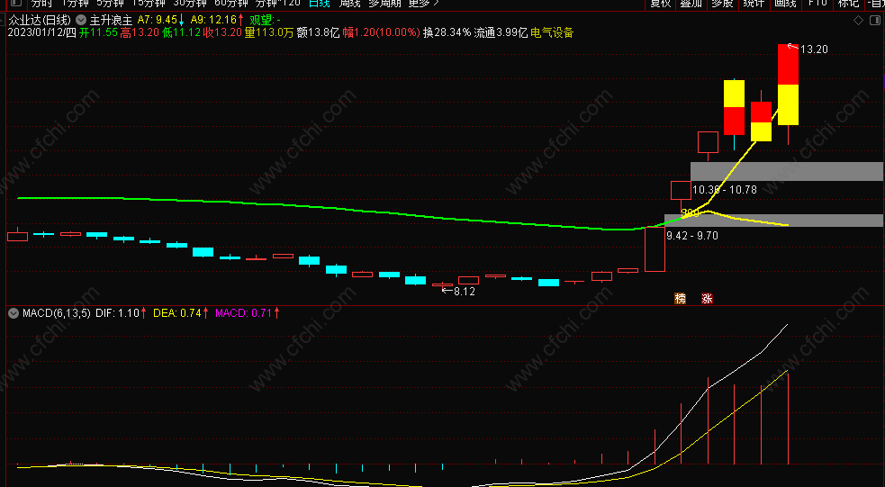 观望:IF(A7=A9,A7,DRAWNULL),COLORGREEN,LINETHICK2;