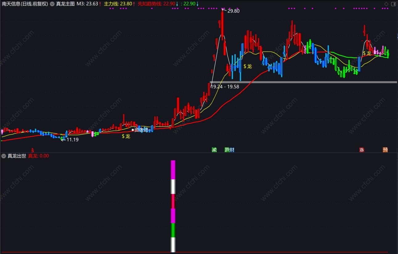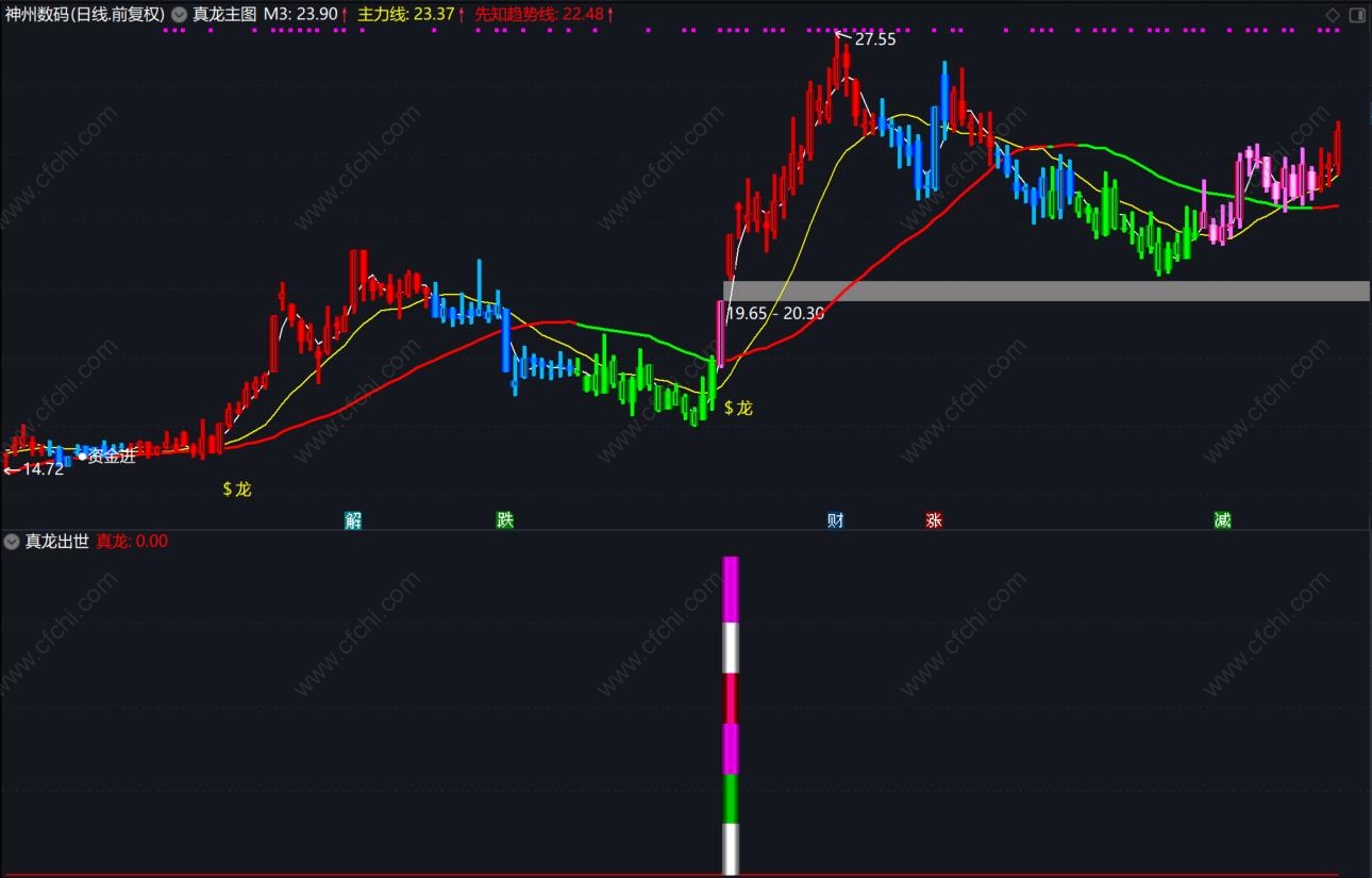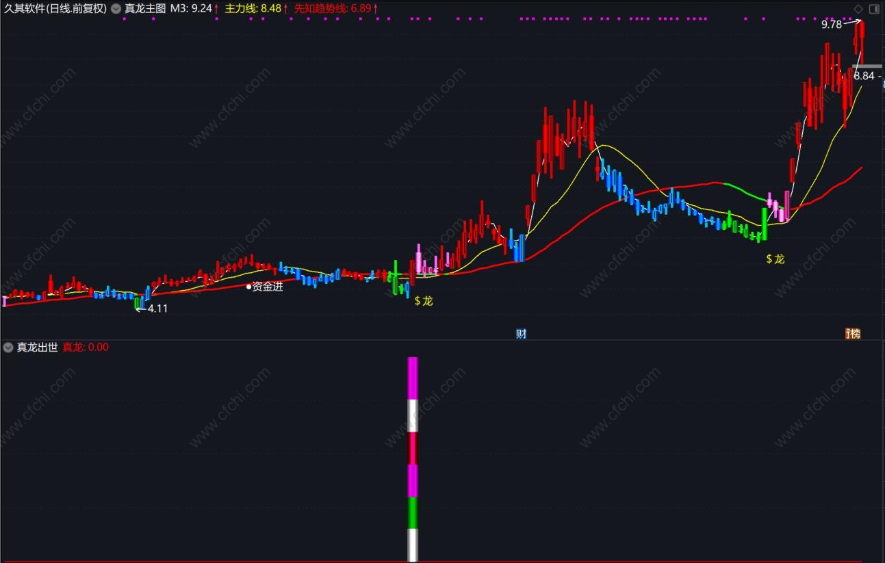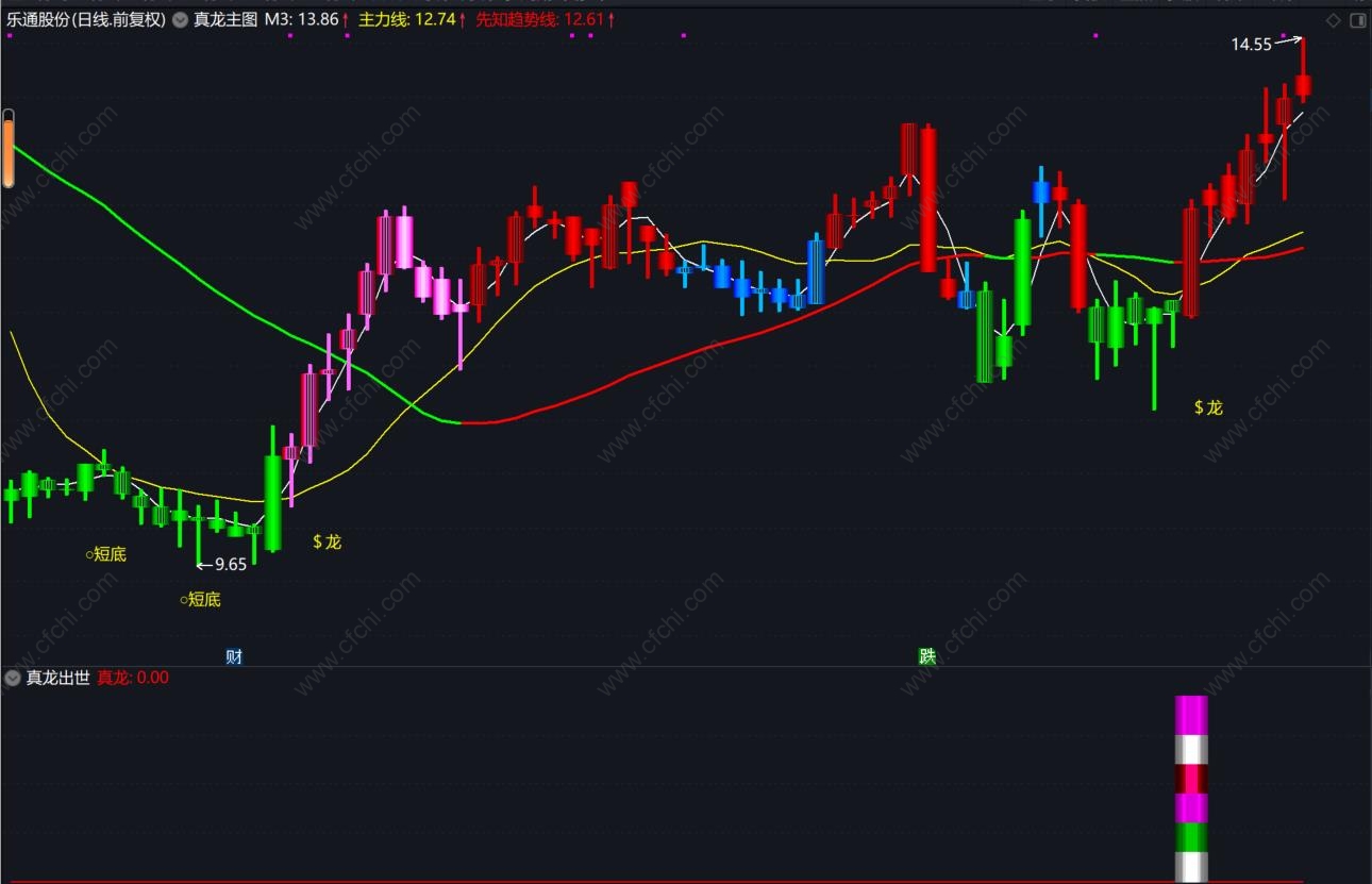 真龙主图由短中长三条指标线,也即趋势线,和几组彩色K线组成,短线趋势攻击性强,长线趋势线变红,趋势转强,变绿则趋势走弱,K线色彩分明,粉色短线走强,红色中线走强,蓝色短线走弱,绿色中线走弱。。。通俗易懂。